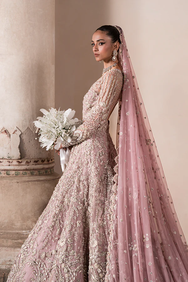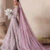 ALIYAH, a lavender dream in bridal couture, enchants with a net gown adorned in 3D off-white embellishments. The intricate dabka and jeweled work create a mesmerizing pattern, and the train adds a touch of drama. Complementing the ensemble, a delicate veil drapes with beautiful patterned designs. Soraya Bridal Couture’s mastery of color and artistry ensures this traditional piece captivates hearts, making your wedding day truly unforgettable.