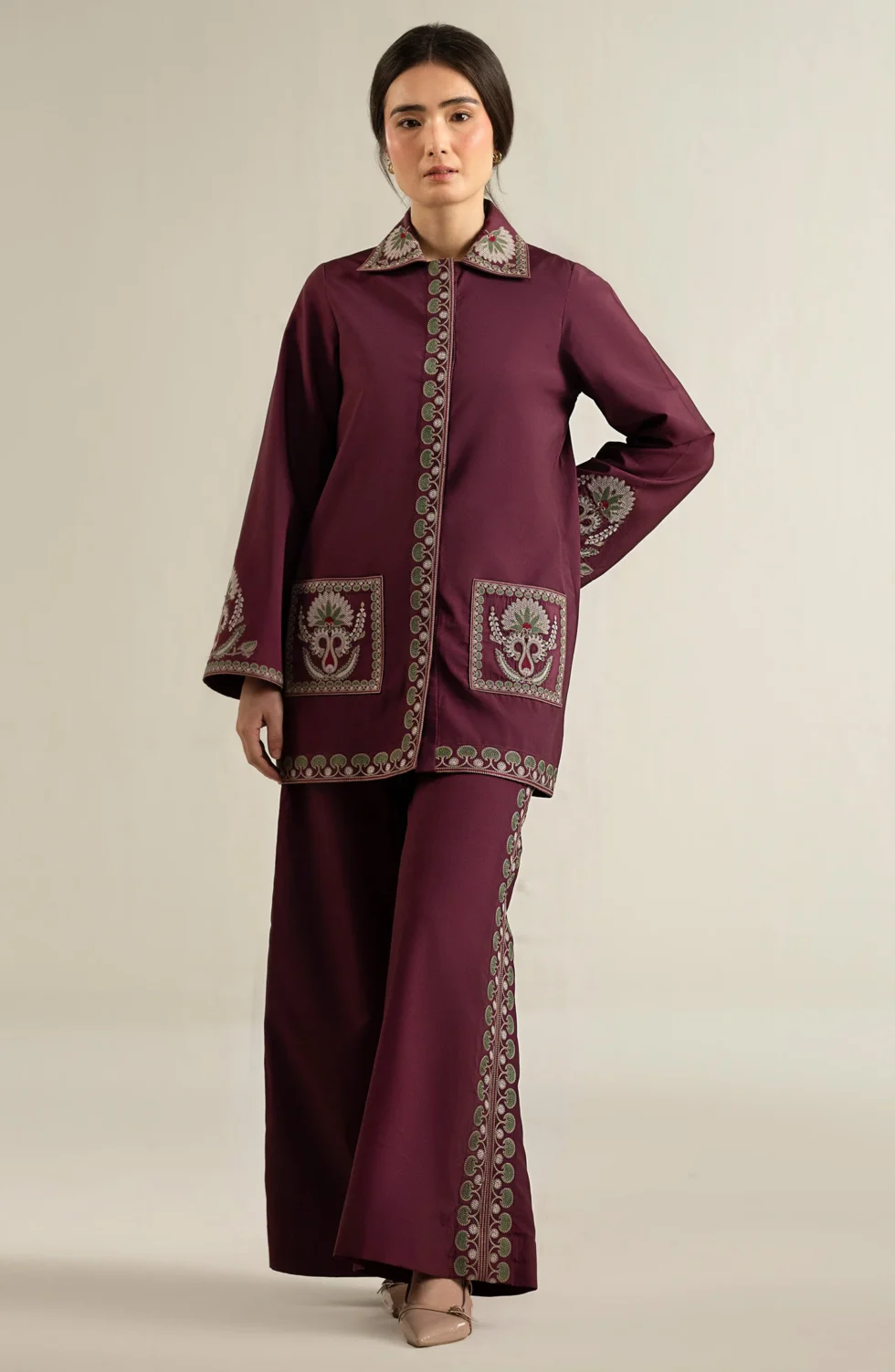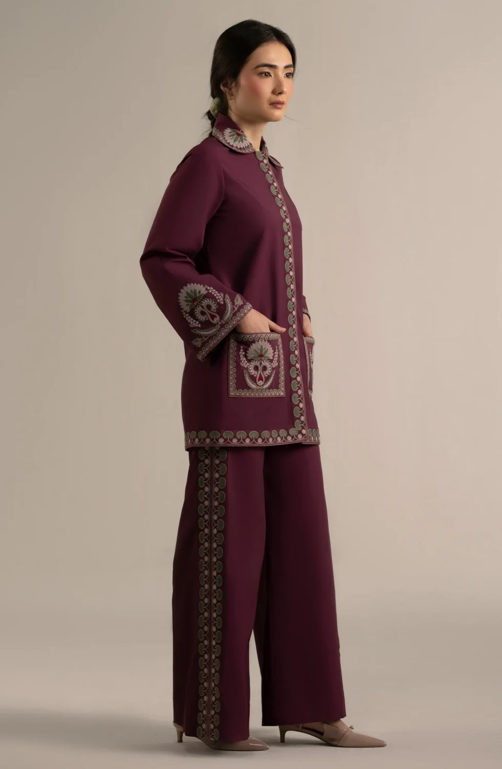 The embroidered button-down purple set offers a perfect blend of elegance and vibrant detail.