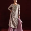 Immerse yourself in the splendor of tradition and elegance with this enchanting lilac tissue ensemble crafted from luxurious pani tissue. The dress features an intricately embroidered neckline, with embellishments artfully strewn throughout, creating a mesmerizing interplay of textures and patterns. The delicate embroidery is further highlighted by a scattered spray of embellishments on the sleeves and all over the front.