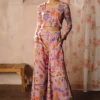 Radiate in a symphony of vibrant hues with this chiffon top featuring button-loop detailing and flared pants.