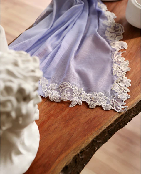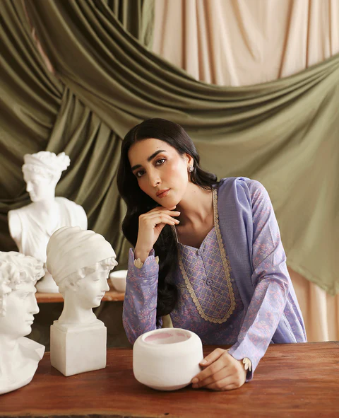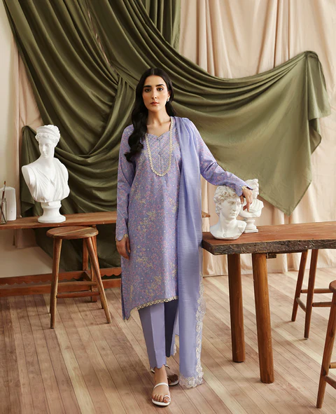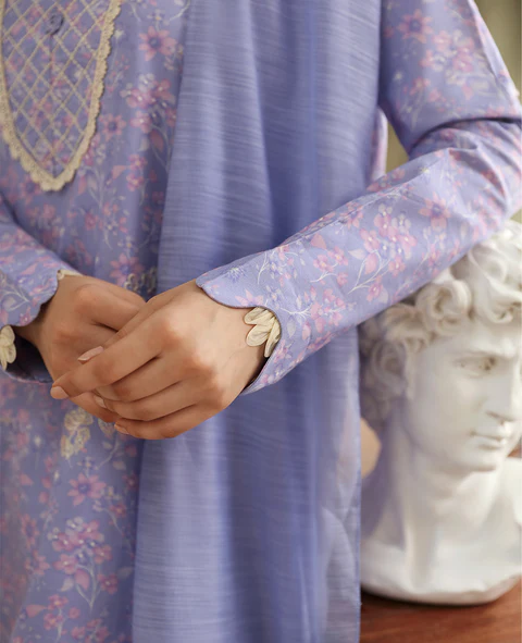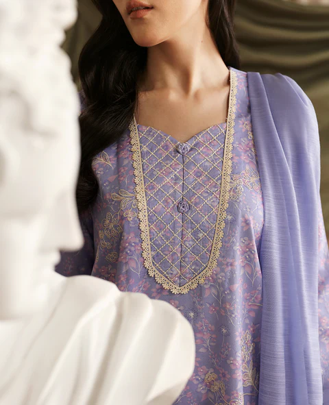 Enveloped in a gentle lilac, this outfit captures timeless elegance. The shirt, featuring drop corners, is beautifully embroidered in white on a lavender print. Its neckline is accentuated by crisscross topstitching, complemented by scalloped sleeves and delicate lace trim along the neckline and hem. Organza detailing on the sleeves adds an enchanting touch. Paired with shalwar, the ensemble is completed by a dupatta that boasts exquisite embroidery with L-shaped corners, infusing the look with a refined grace. Color: Lilac Size: S,M,L,XL
