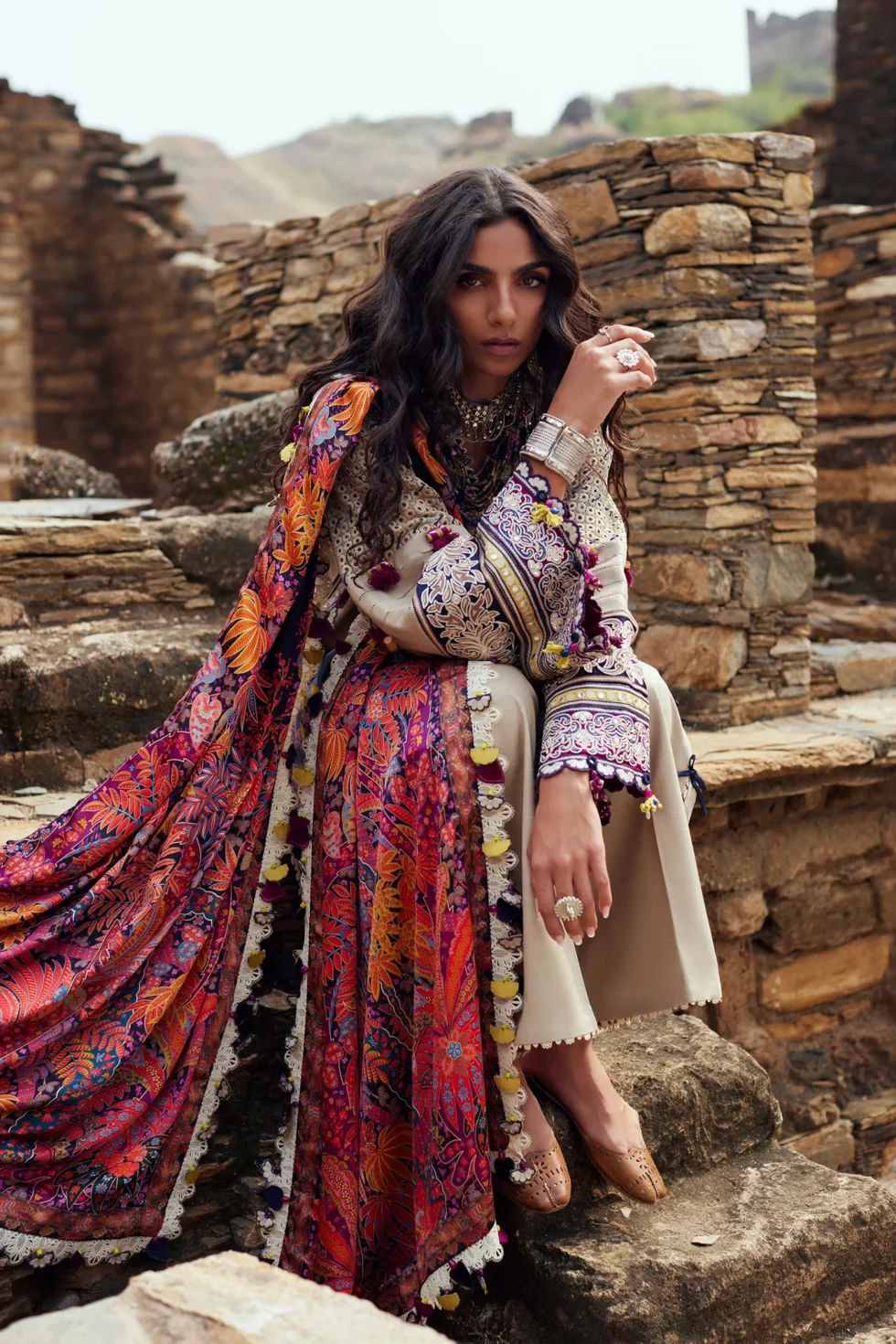 Introducing ‘Arsia’—a luxurious masterpiece that effortlessly blends bohemian artistry with the refined elegance of winter. The rich, warm beige canvas is elevated by the earthy sophistication of intricate tribal embroidery. Delicate motifs in ivory, frost blue, and florentine are meticulously crafted, telling a timeless story of craftsmanship that seamlessly merges the essence of winter with free-spirited allure.Paired with a contrasting printed silk dupatta, this ethereal ensemble strikes the perfect balance between modernity and tradition.