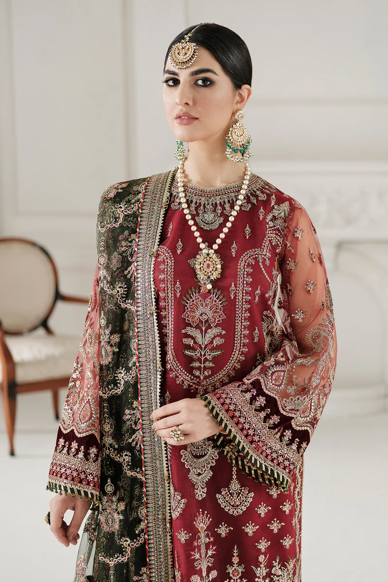 The entrancing red 3-piece ensemble featuring an elegant shirt with iridescent embroidery on its front, back and sleeves. The border and sleeves are embellished with alluring velvet embroidery. A deep contrast of red shirt and green dupatta resonates an enchanting fusion of splendour and majesty. The dupatta is ornated with ravishing embroidery and a blend of velvet grandeur. The embroidered silk trouser accompanies the resplendent duo. So, you can go for unstitched or stitched. Ultimately, you get to decide between a long or a short shirt, if you’re vouching for stitched option. Color: Red TYPE:STITCHED Size: XS S M L XL CUSTOM SIZE