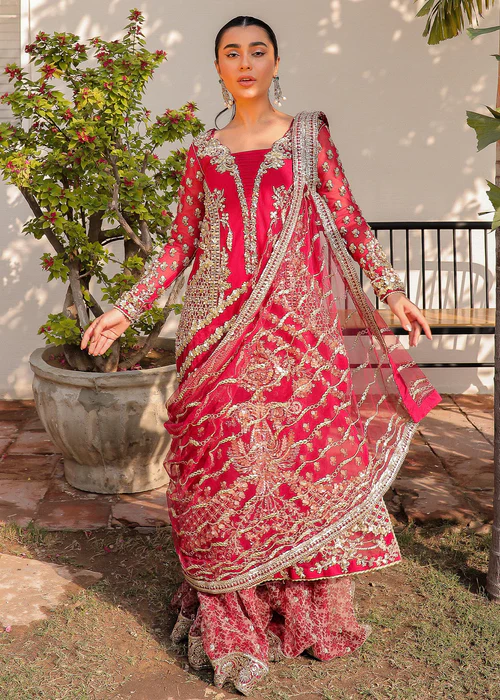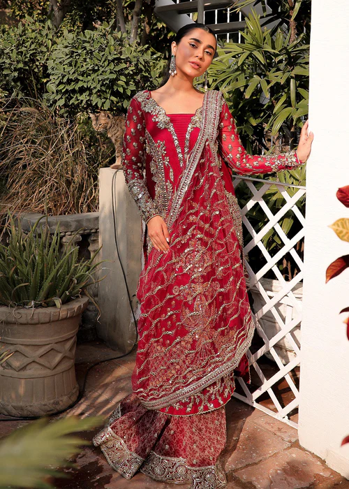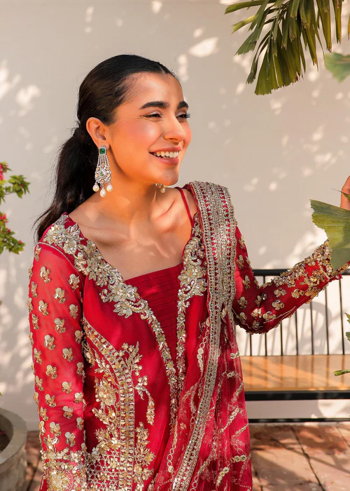 Presenting the ever so popular red! Meticulously embroidered tilla work to look like naqshi, the entire front is embellished in Gota patti, pearl and champagne crystals. The embroidery is a mix of beautiful floral borders and delicate jaalis. The dupp is adorned in Gota and pre stitched to be draped in any style. The Sharara is a beautiful vintage print with gold tilla booti scattered all over and finished with a tilla border. Make a show stopping entrance at any function!