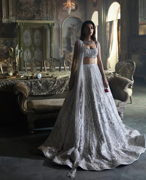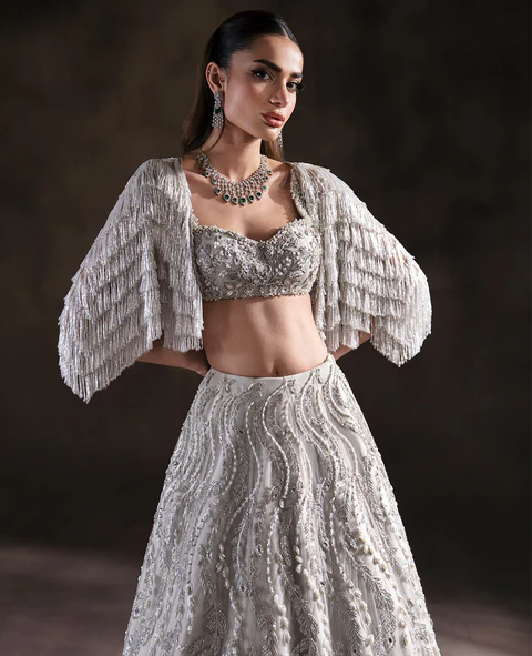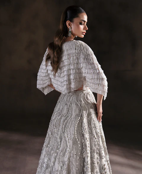This white lehenga-choli with a net cape redefines bridal elegance with its intricate botanical patterns and embellishments. The choli’s sweetheart neckline and beaded pearl straps add subtle opulence, while the lehenga dazzles with pearls, sequins, dabka, and crystals. The net dupatta features whimsical tassel details and a refined border, completing this vision of pure grace. Color: White Size: XS S M L XL