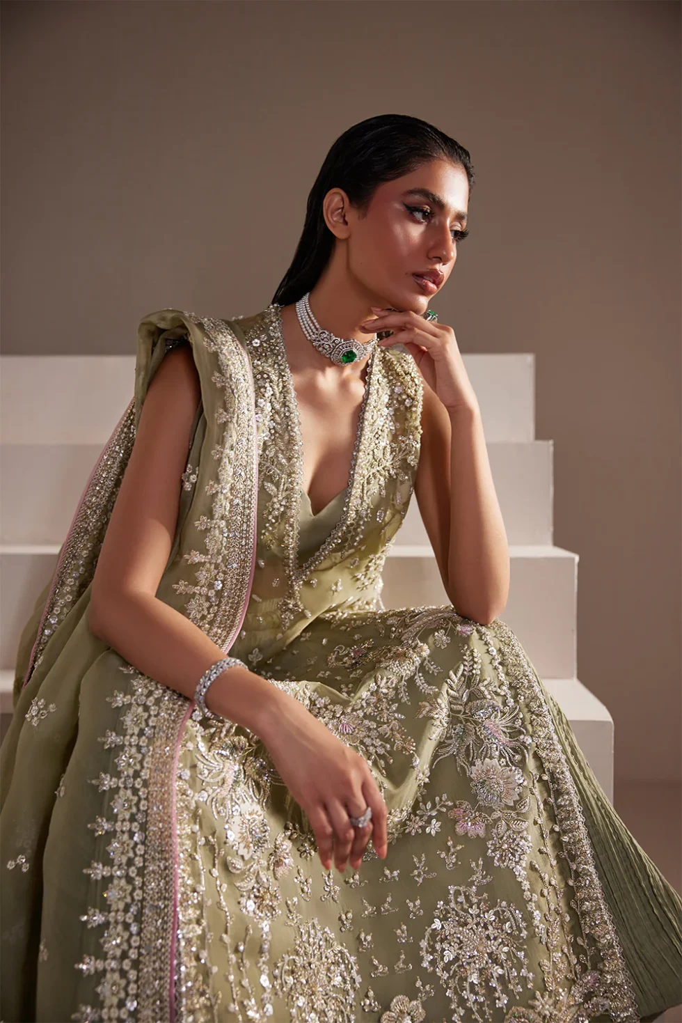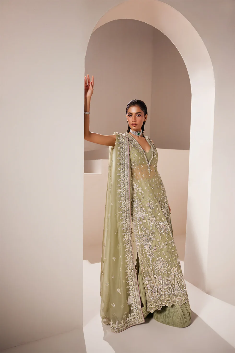 Celeste is a refined organza shirt with a sensual dabka and cut dana handwork neckline, paired with a matching crushed raw silk bottom. The ensemble is elegantly adorned with delicate chandi embellishments, which cascade across both the shirt and the dupatta, creating a harmonious and timeless look.