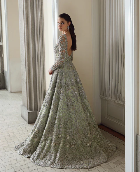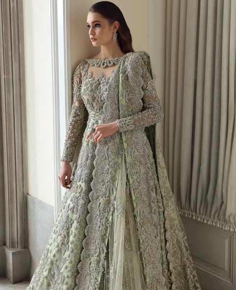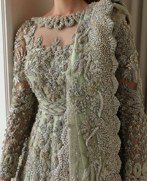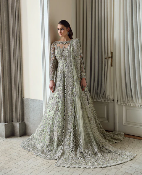 Celestia features a boat neckline gown with heavy jewel details and a scalloped dupatta. The design is inspired by palm trees and starry motifs, blending French floral elements with bethki and naqshi work. The gown is further embellished with kora, dabka, resham tilla work, Swarovski sequins, and cutdana.