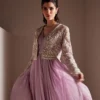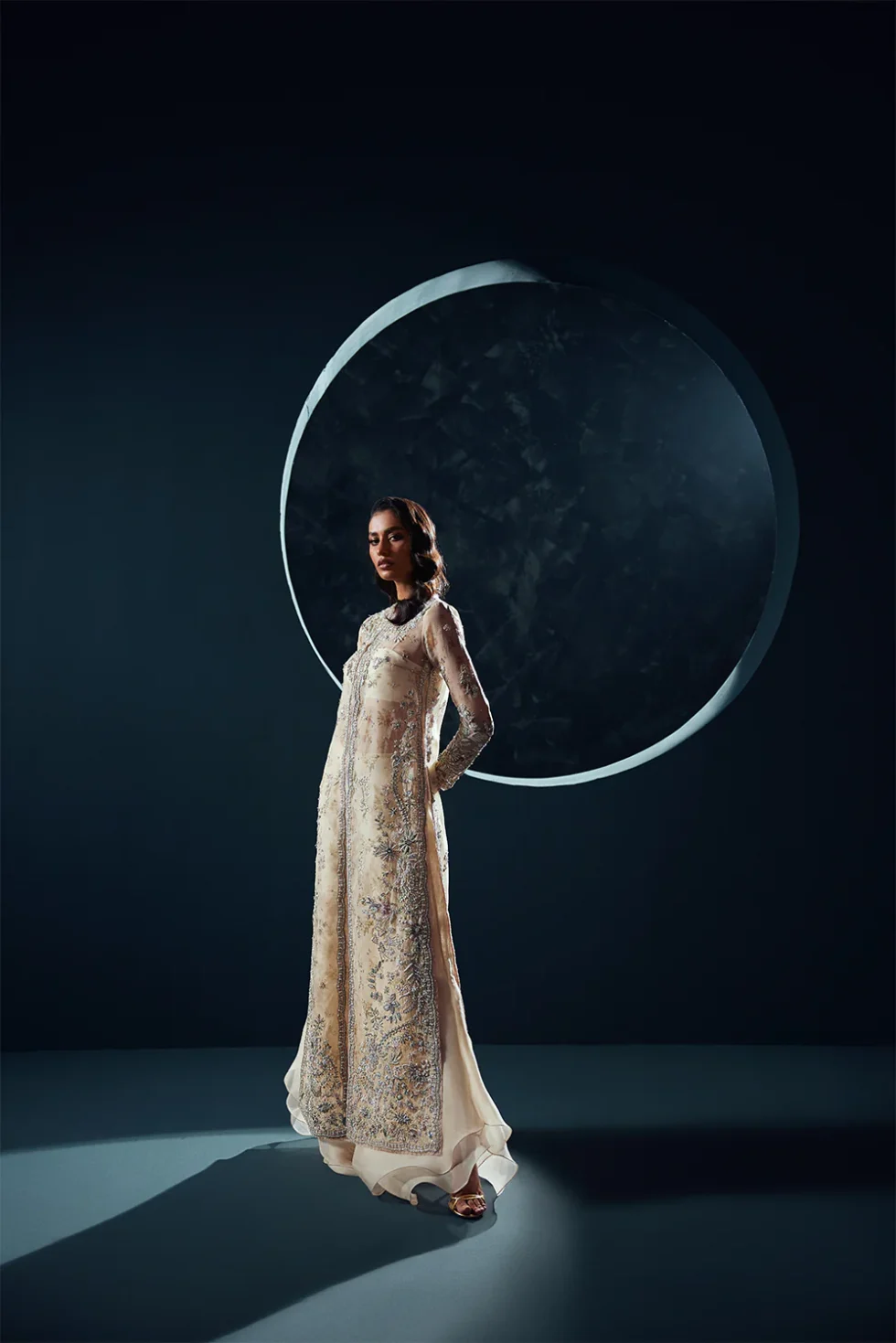Celestial is an enchanting dawn cream printed organza jacket adorned with intricately embellished floral motifs, exuding a blend of elegance and modern flair. It is paired with ethereal organza ruffle sharara bottoms and a matching crushed ruffled silk dupatta exudes elegance and modern flair, perfect for sophisticated look.