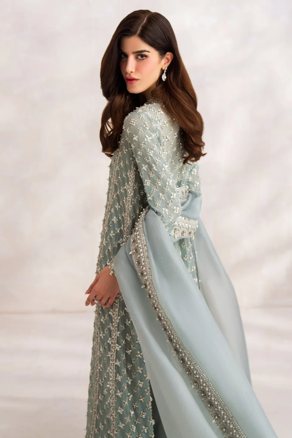 Celestine’ captures the essence of opulence with its chiffon frosted tulle fabric. The hand-embellished panel shirt, resplendent with sequins and iridescent crystals, demonstrates exquisite craftsmanship. Accompanied by a delicate organza