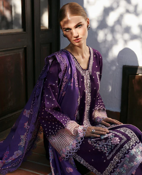Cemile’s purple hue is elegantly crafted with delicate Chinese embroidery, creating a harmonious blend of lilacs, pinks, whites, and greys. The geometric structure and richly dyed lawn fabric are enhanced by a voile printed dupatta, making this piece a regal choice. Color: Purple Size: Unstitched