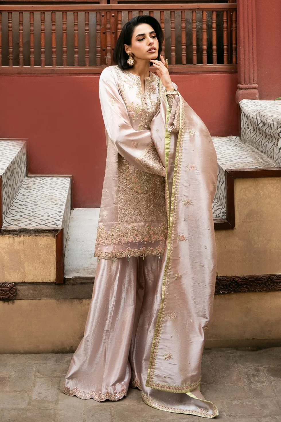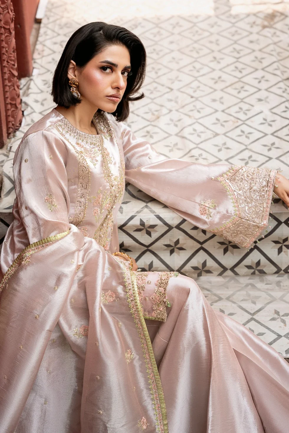 Exquisite embroidery adorned with tilla and shimmering sequins, enriched by resham threads and pure zardozi craftsmanship. Kora, dabka, nakshi, delicate pearls, crystals, and Japanese cut dana add layers of elegance, making each stitch a celebration of timeless artistry and luxury.