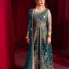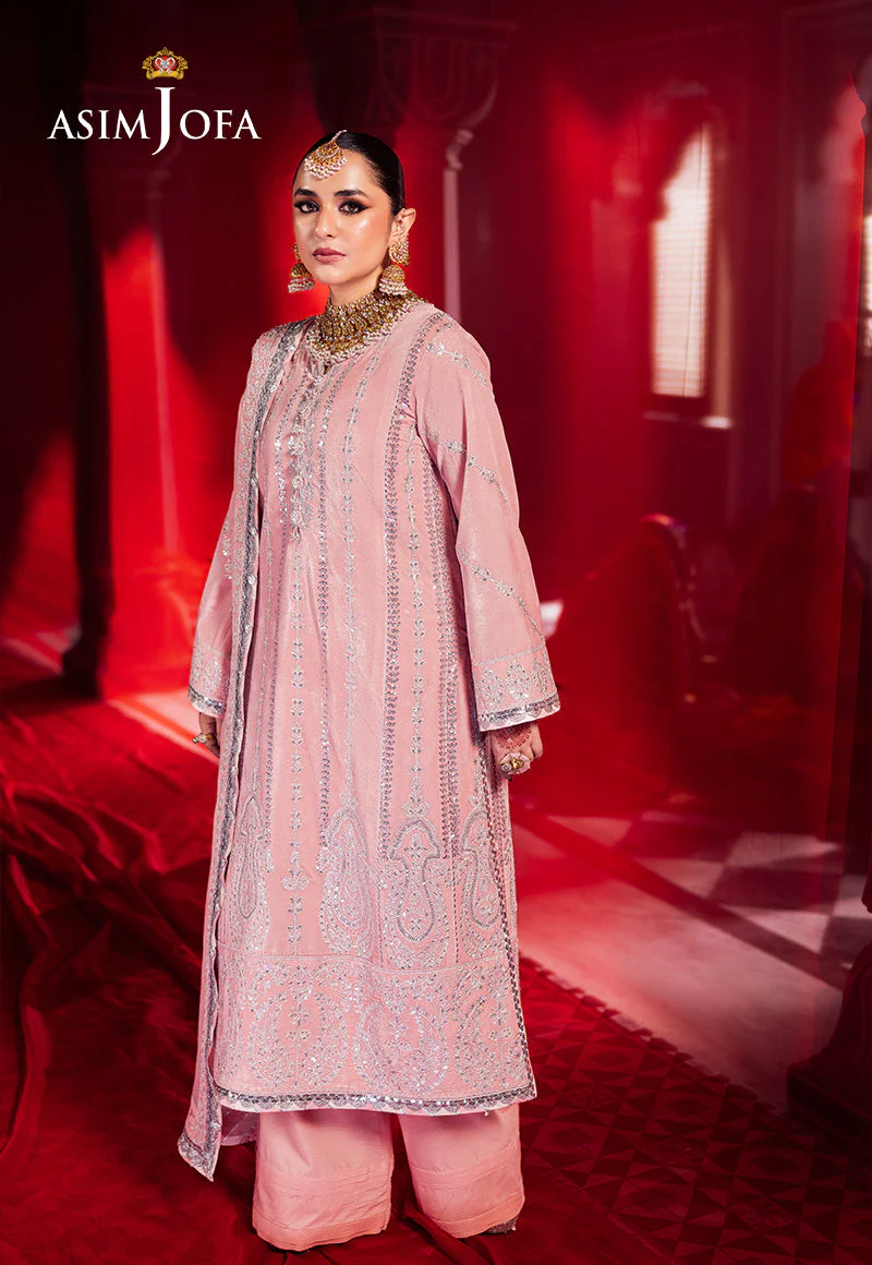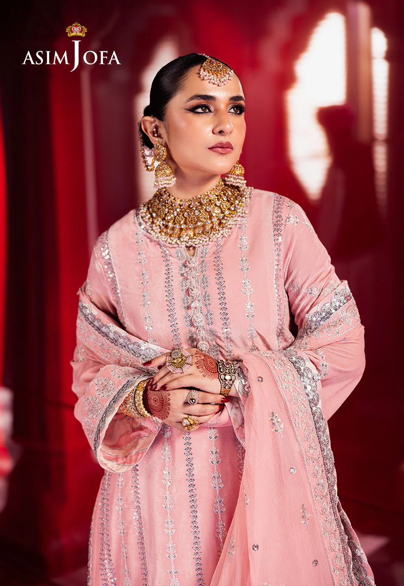 Bathed in the soft glow of a flamingo hued rose, this light pink ensemble is a delicate ode to feminine grace and elegance. The velvet shirt, a canvas of refined beauty, features multiple embroidered panels, where silver doriwork and zari threads intertwine like moonbeams across a serene sky. Silver cupped sequins glisten like droplets of dew, catching the light with every movement. Paired with an embroidered dupatta, this ensemble becomes the very essence of grace, transforming you into a vision of timeless allure.