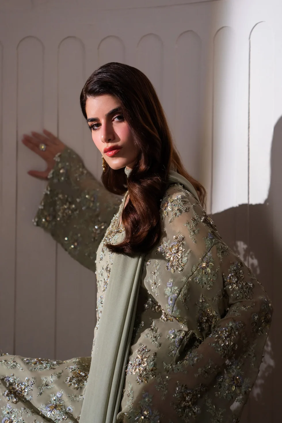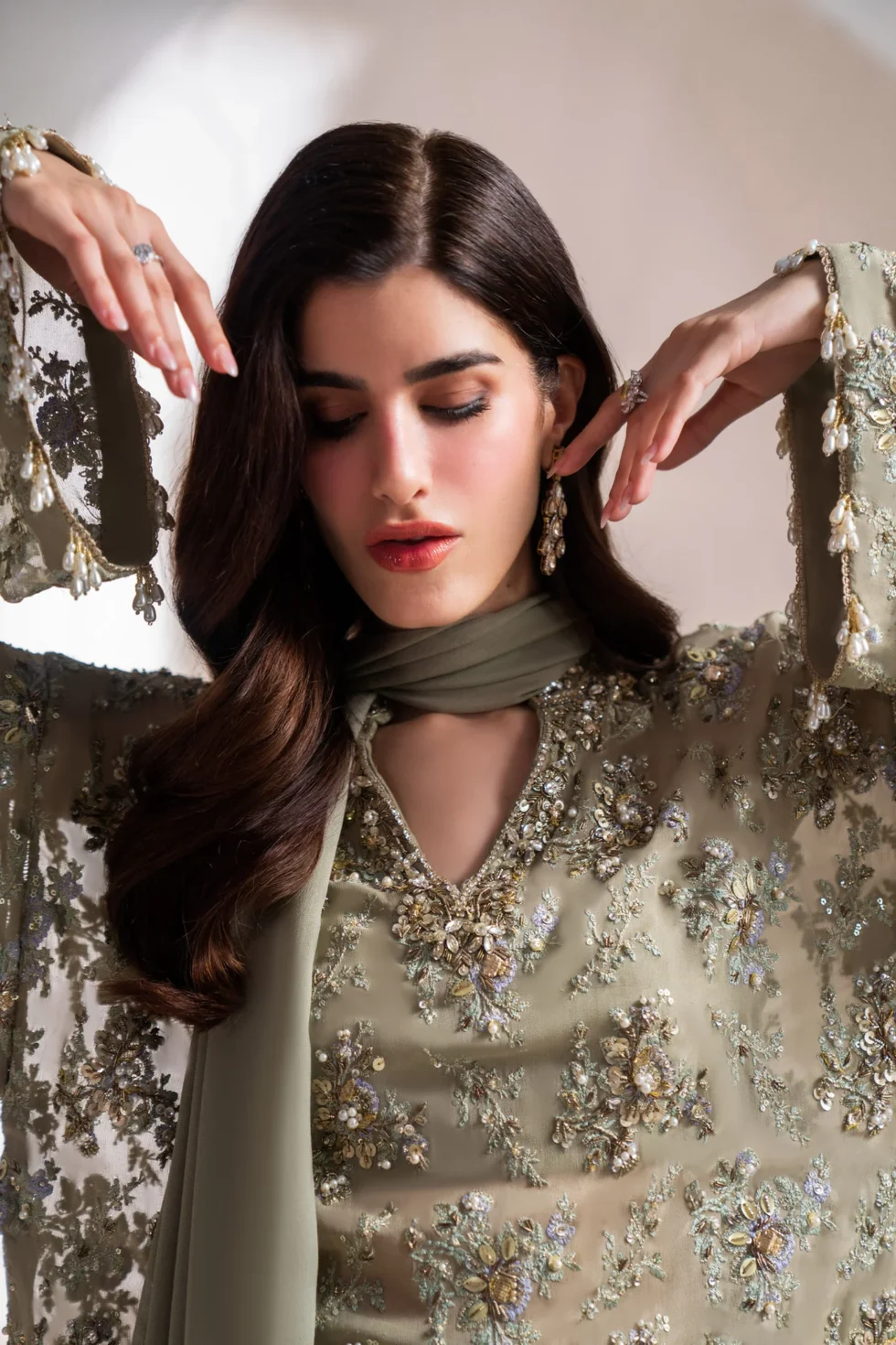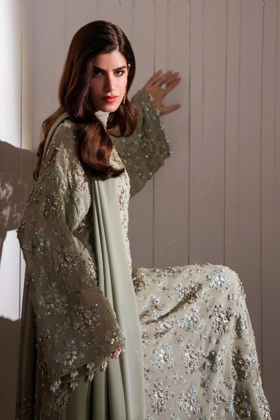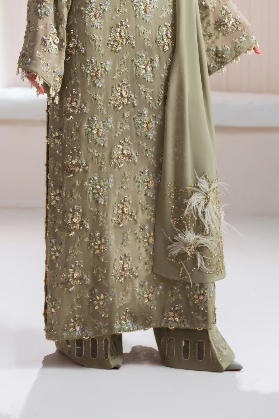 Enter a realm of sublime luxury with ‘Clarté,’ an Iseo Sage Green creation that masterfully redefines regal elegance. This breathtaking drop-shoulder, long-shirt silhouette is a testament to refined craftsmanship, adorned with opulent gold-chrome accents, where each floral motif is brought to life with dazzling sequins, delicate gotta, and shimmering crystals. A chiffon dupatta, lavishly detailed with plush fur and hand-embellished intricacies, drapes effortlessly, while raw silk palazzos, embellished with a cascade of delicate crystals, radiate an aura of pure grandeur. Perfect for the upcoming wedding season, ‘Clarté’ is not just an ensemble, but a statement of enduring elegance and exceptional luxury.