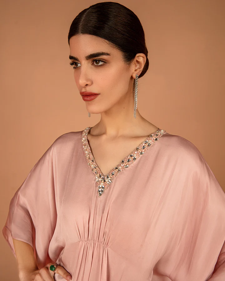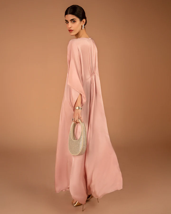 Brimming with structured finesse, Derifa showcases the fluidity of the kaftan in a delicate pink tone. The silk piece is brought to life via an artistically arranged pattern of sequins and crystals. With meticulous tailoring and finesse, this unique piece is perfect for all your special events.