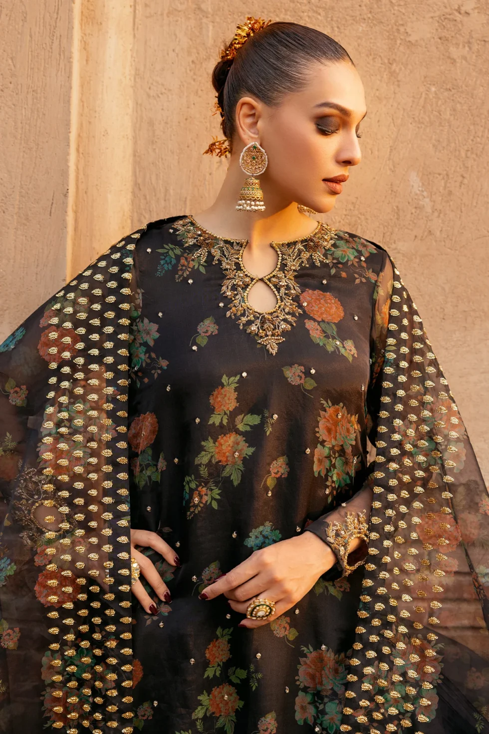 Organza Printed Shirt with embroidered front neckline and embroidered sleeves motifs.
