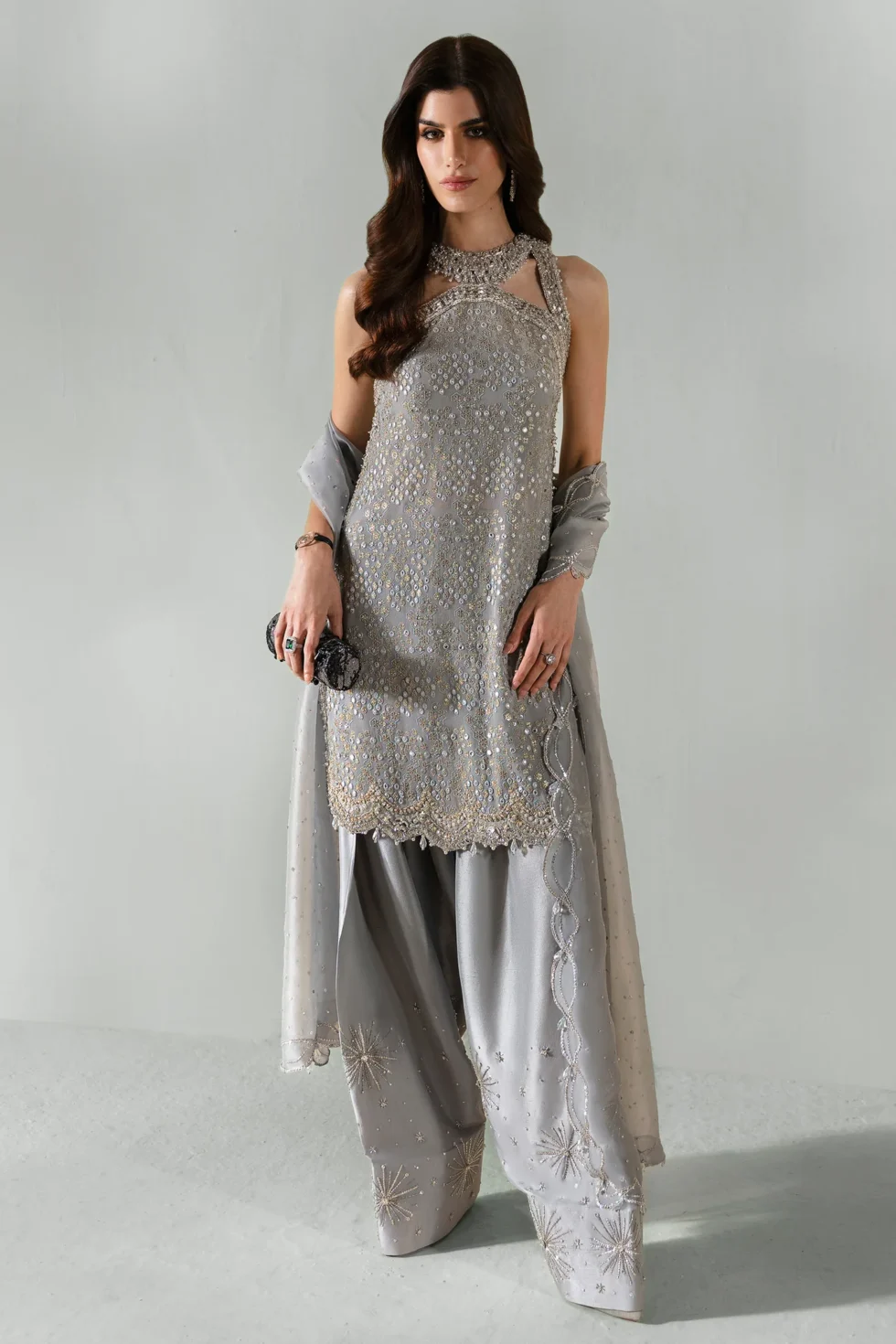 Élan Luxury Prêt unveils Éclat de Glace, a resplendent creation in silvery-grey that epitomizes contemporary luxury and effortless glamour. This stunning ensemble commands attention with a statement crystal-encrusted neckline—a flawless stroke of brilliance exuding an aura of opulence. Every detail is a work of art, from the hand-crafted embellishments that shimmer exquisitely with each movement to the tonal raw silk shalwar adorned with delicate cut-dana and sequin motifs, evoking the allure of stardust woven seamlessly into fabric. Completing this masterpiece is a pure organza dupatta edged with intricate scalloped embroidery and encrusted with glittering sequins, radiating an ethereal elegance that leaves a lasting impression. Designed for the sophisticated woman who embodies grace with every step, Éclat de Glace is the ultimate statement of refined allure, ideal for intimate gatherings and grand fêtes alike.