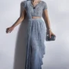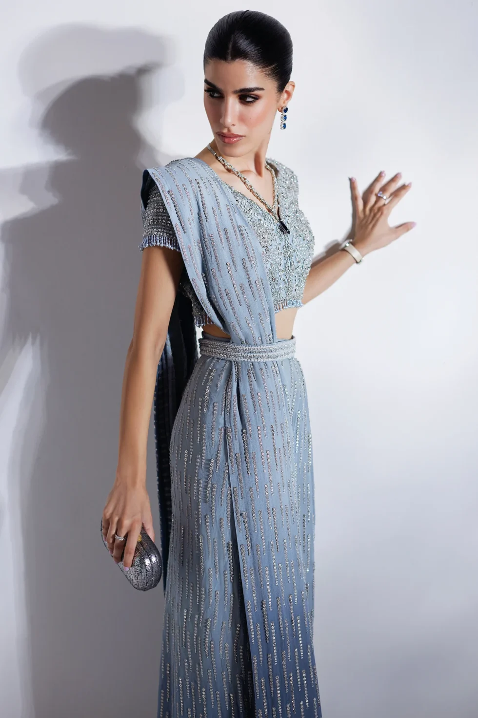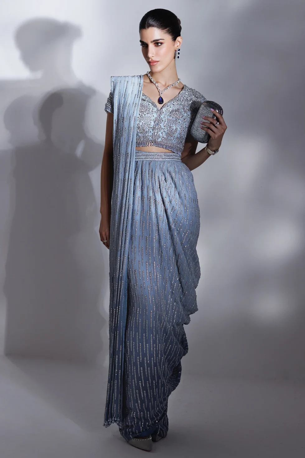 Éclat Glacé’ unveils a breathtaking shade of ice blue, adorned with gleaming crystals and glistening sequins, creating a heavenly composition. The ensemble features a meticulously embellished blouse, adorned with intricate details, offering a modern reinterpretation of the saree. This ethereal masterpiece is an exquisite addition to your formal wardrobe, radiating timeless elegance and sophistication.