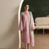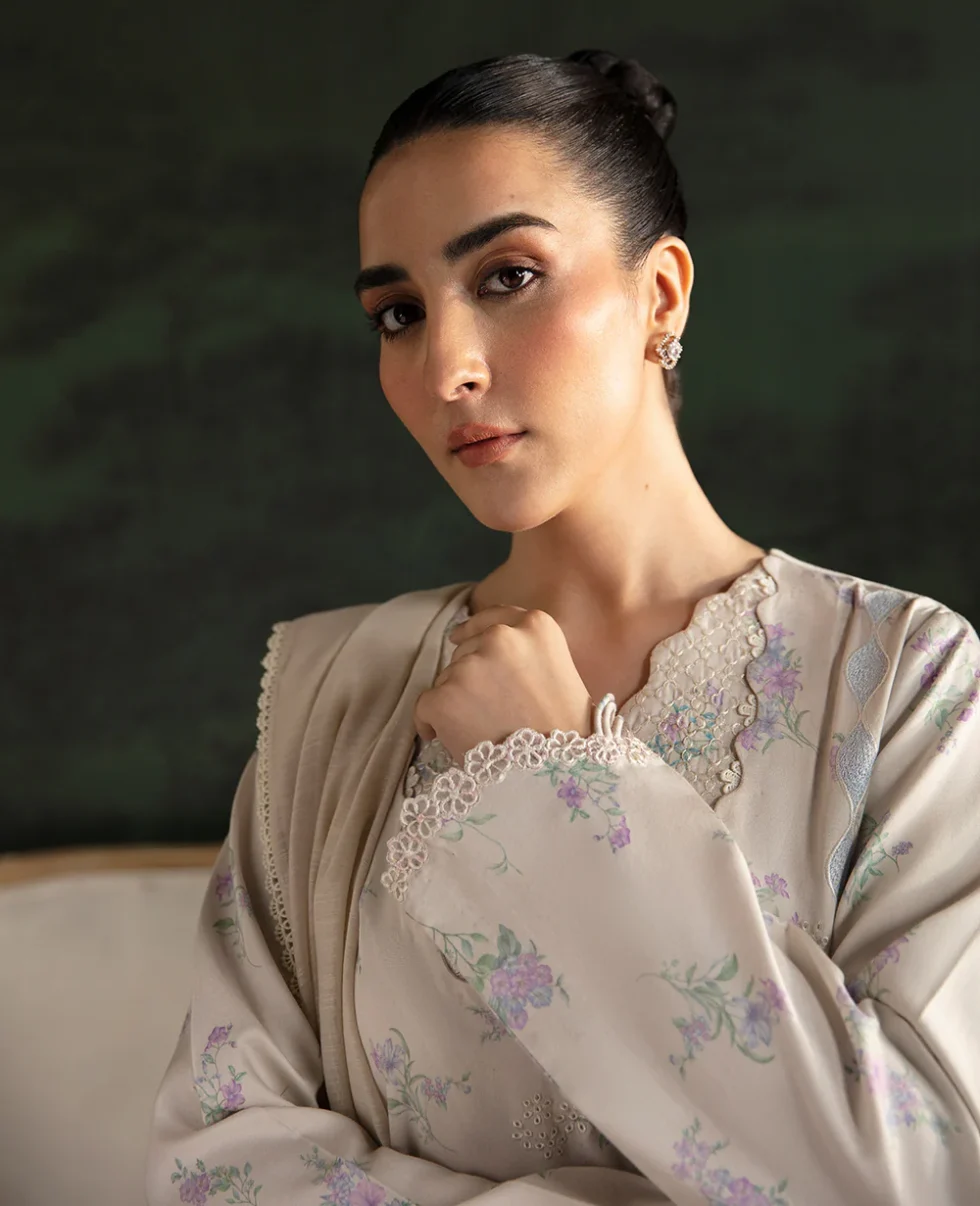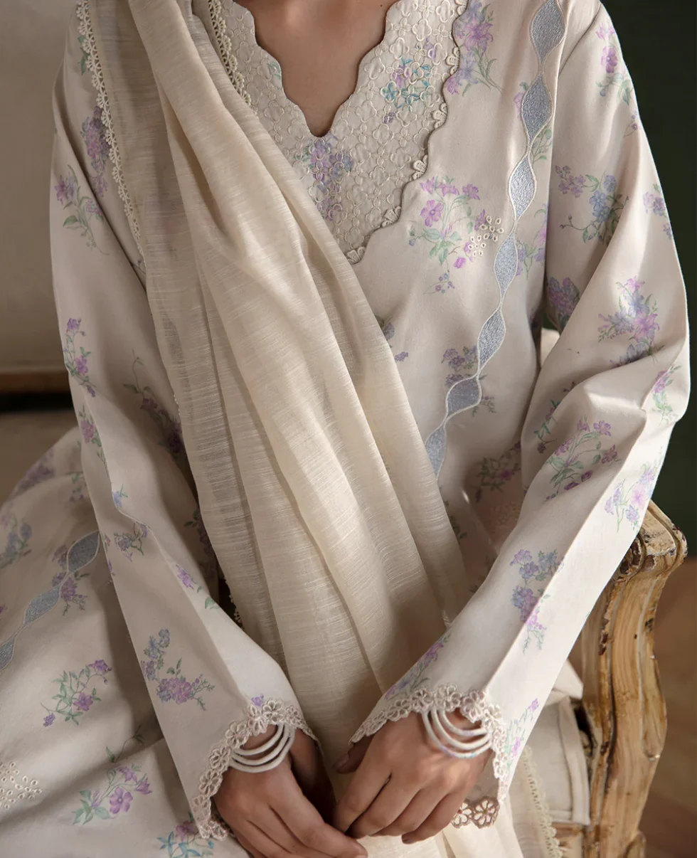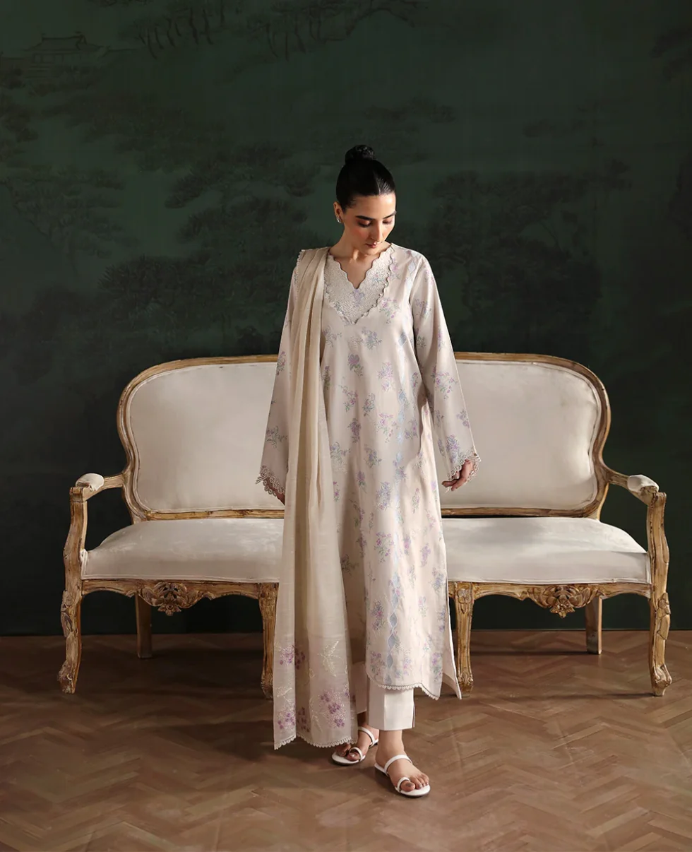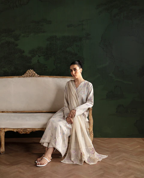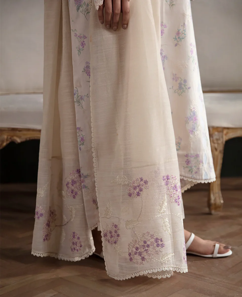 Elka is a digitally printed shirt in a beautiful rosette design featuring a spiral pattern, elegantly complemented by slub off-white embroidered dupatta pallu with intricate shadow work embroidery paired with chic cigarette pants that adds a touch of finesse to this sophisticated ensemble.