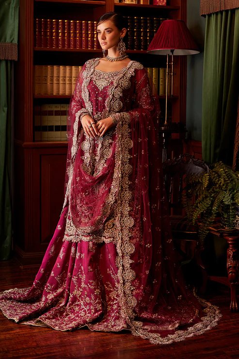 Discover Elysia, a bridal outfit that captures the spirit of nature’s beauty. The shirt is embellished with intricate motifs, handcrafted from delicate beadwork, sequins and naqshi detailing. The ensemble is adorned with cascading vines and blooming flowers thus creating a sense of enchantment and grace. Elysia a perfect choice for the bride who wants to embrace her love for nature on her special day.