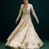 Elysian is an exquisite ivory organza paneled pishwas, adorned with delicate floral layouts of dabka and pearl beadwork. The hems and sleeves are beautifully detailed with hanging pearls and beads, adding a touch of opulence. Paired with a matching cream raw silk lehenga, featuring intricate kiran work, handmade cutwork and bead detailing, the look is completed by a net dupatta with a trim that mirrors the lehenga. This ensemble embodies timeless grace.