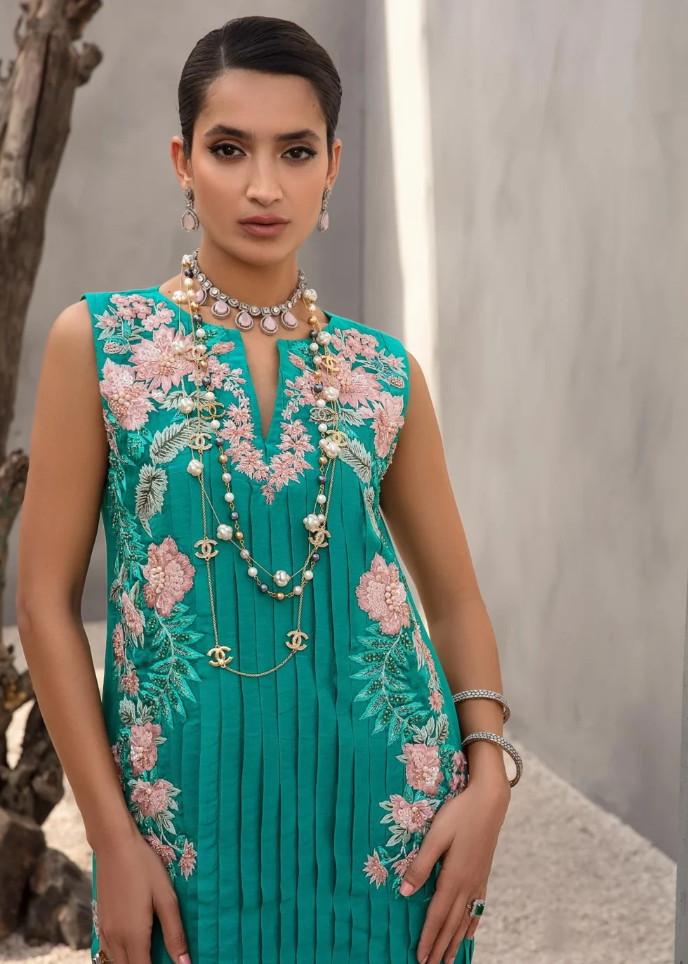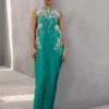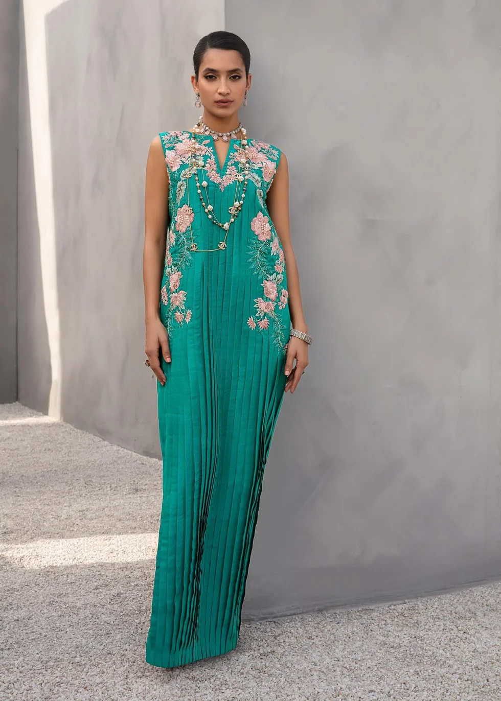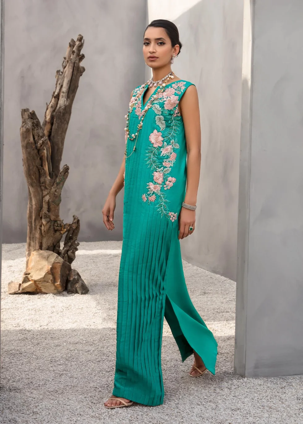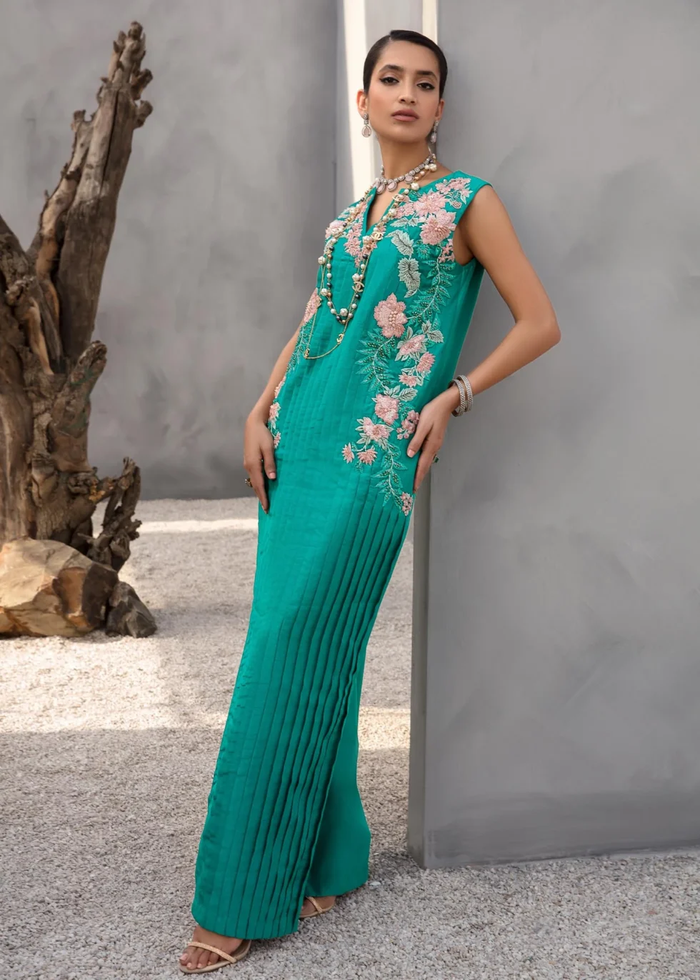 This teal kaftan has a pleated rawsilk front adorned with beautiful floral embroidery in shades of pink and aqua, embellished with sequins work and crystals. Paired with rawsilk pants. Color: Teal Green Size: S, M, L