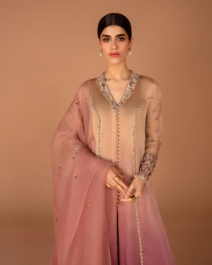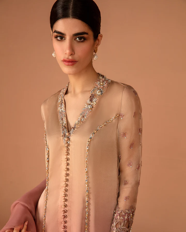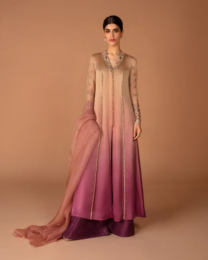 Harmonizing the vibrancy of ombre color gradation, Eshe is simply spellbinding. The silk shirt is uplifted through a myriad of resham, crystals and pearls while the dainty organza dupatta adds the perfect finishing touch for a look that’s pretty and playful.