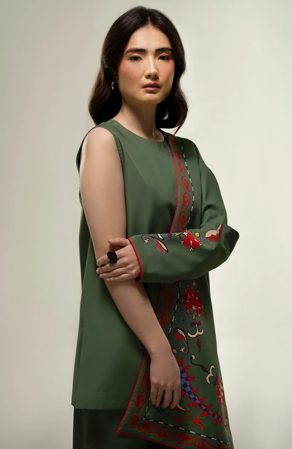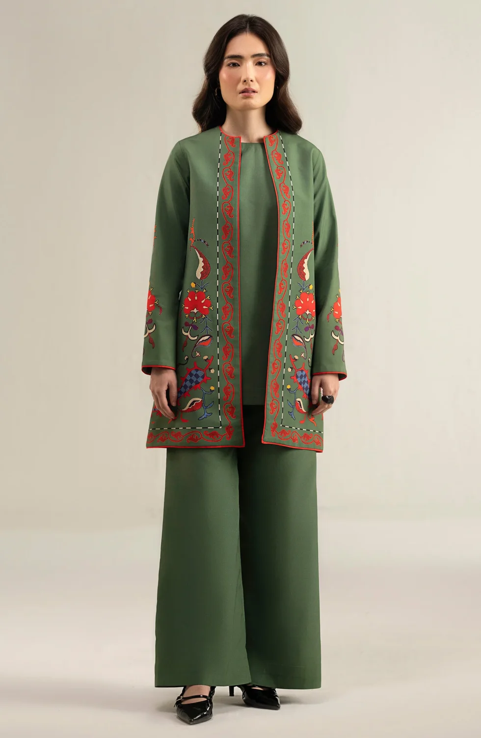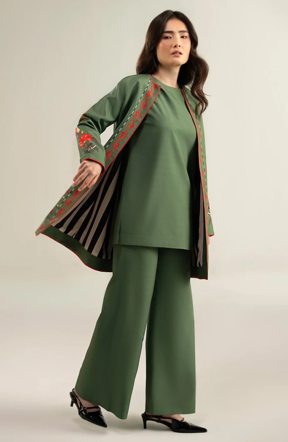 The olive green printed shrug, layered over a sleek short shirt and tailored pants, adds a sophisticated, modern edge to your ensemble, seamlessly blending effortless style with contemporary luxury.