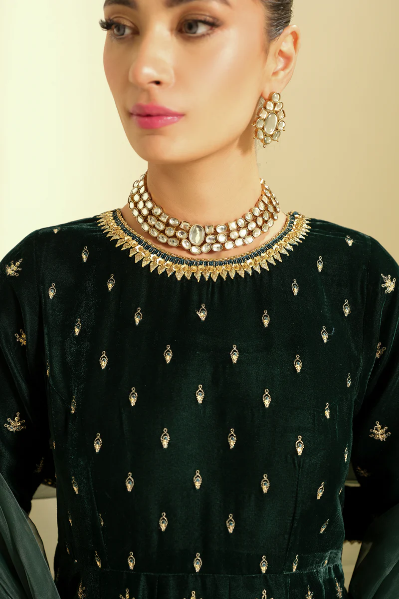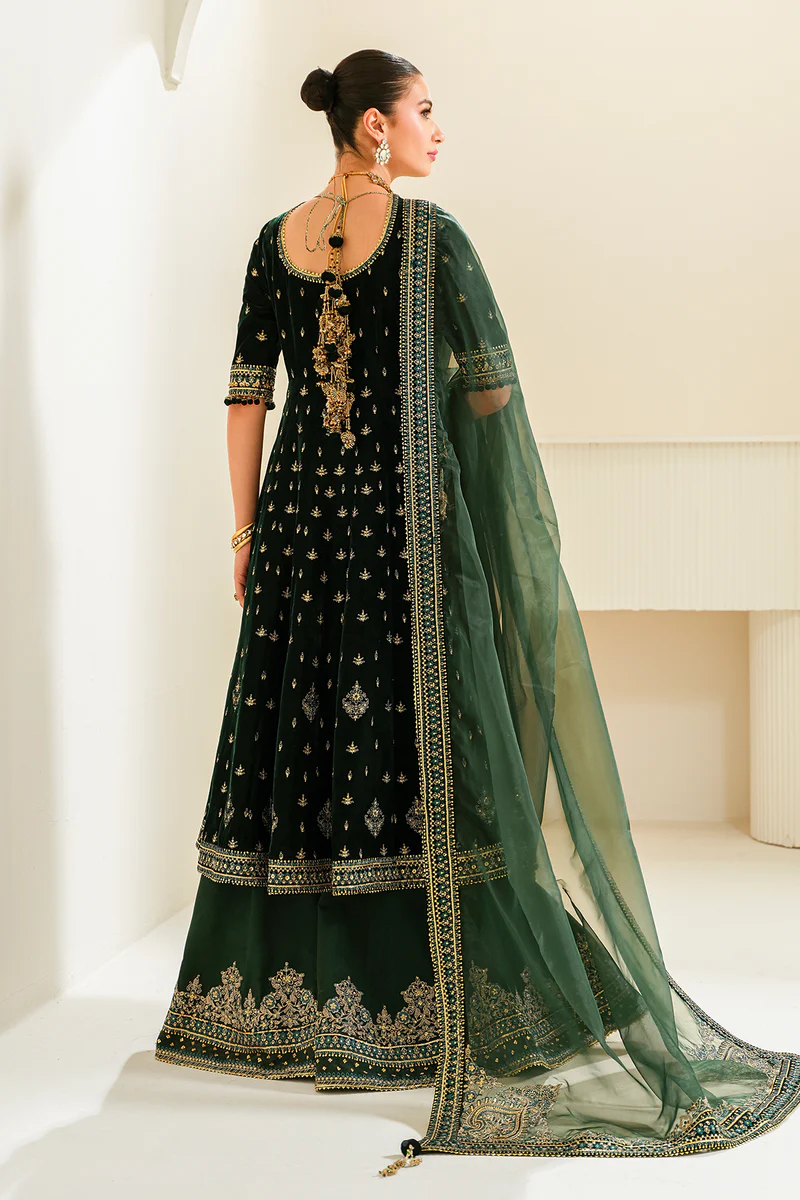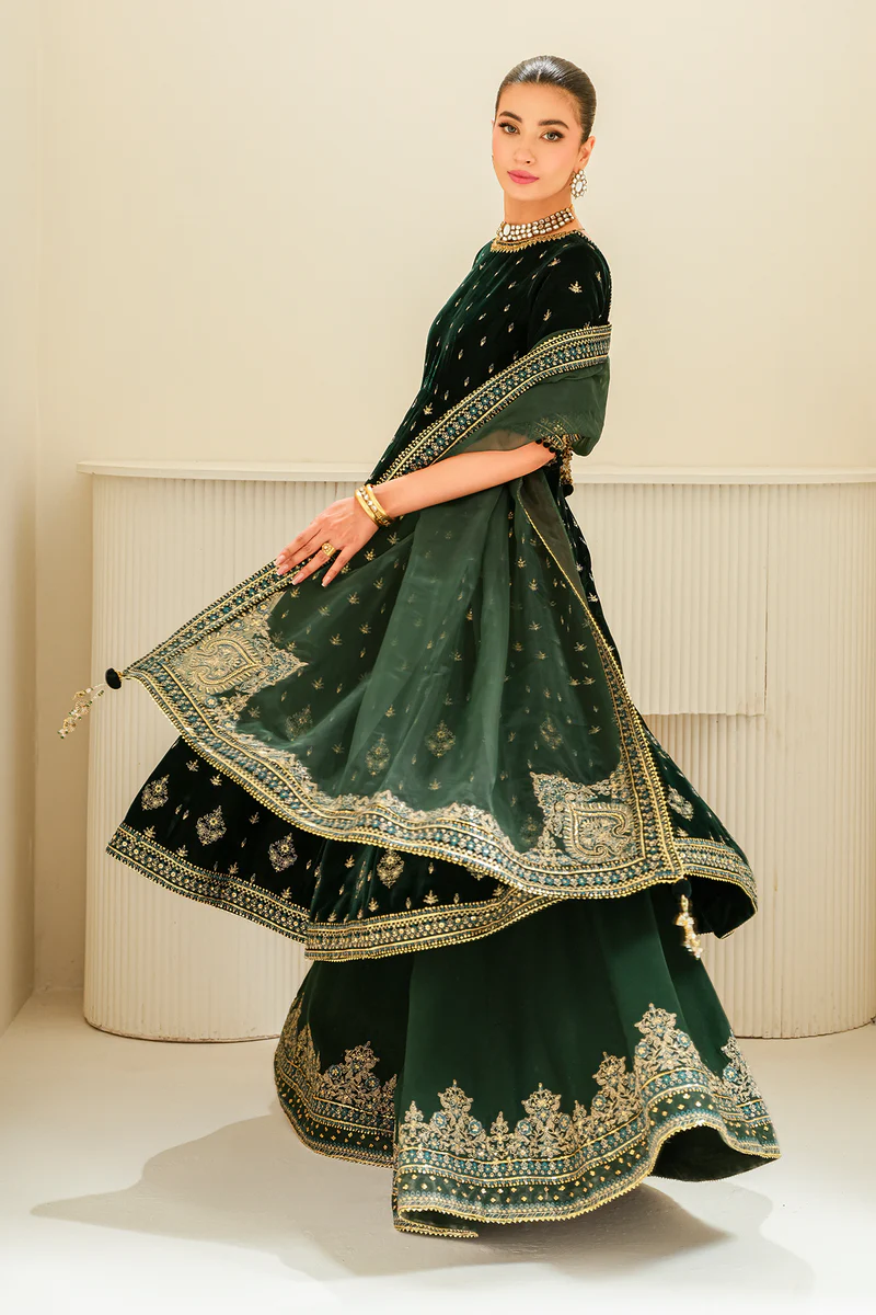This ensemble is a canvas of rich velvet, an intricately embroidered neckline at the front & back, with additional hand-embellished details on the sleeves and frock’s border. The sleeves are equally splendid, with velvet embroidery and a border that matches the grandeur of the frock’s hem, all ready to be customized into a magnificent traditional attire. The trouser comes with an embroidered border and the organza dupatta framed with embroidery completes the look.