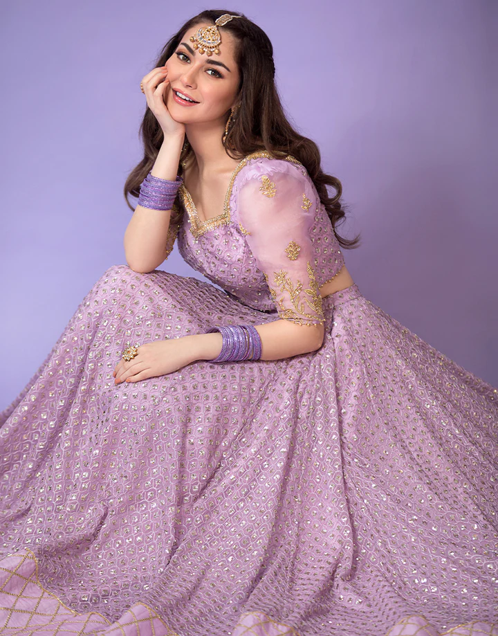 Hoori is a tulle lilac lehnga choli set featuring a dense sequins spread on a bed of embroidered diamonds. The voluminous skirt is paired with a delicately embellished puff sleeved blouse of similar pattern and color. An organza dupatta has been intricately embroidered and dyed in two tones to complete this dreamy look.