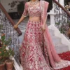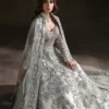 In mint green, this gown blends romantic silhouettes with exquisite hand-finishing. The viscose choli features a sweetheart neckline and stone-embellished body, complemented by full sleeves adorned with floral arrangements and lama finishes. The flared lehenga panels showcase lama lining, sequins, and 3D fabric flowers for added texture, while the organza dupatta adds elegance with crochet detailing and scallop edges. Crafted for a bride of grace and poise, each element reflects meticulous craftsmanship in this timeless bridal piece.