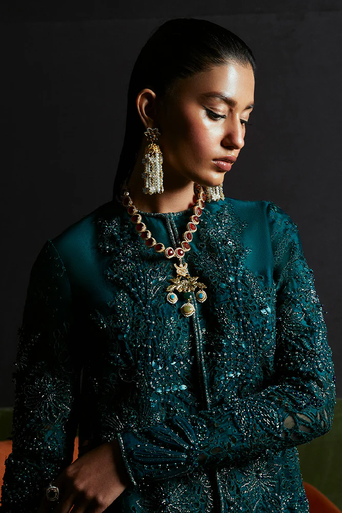 TEAL GREEN, FRONT OPEN ORGANZA JACKET WITH CUTWORK ALLOVER AND FITTED SLEEVES.