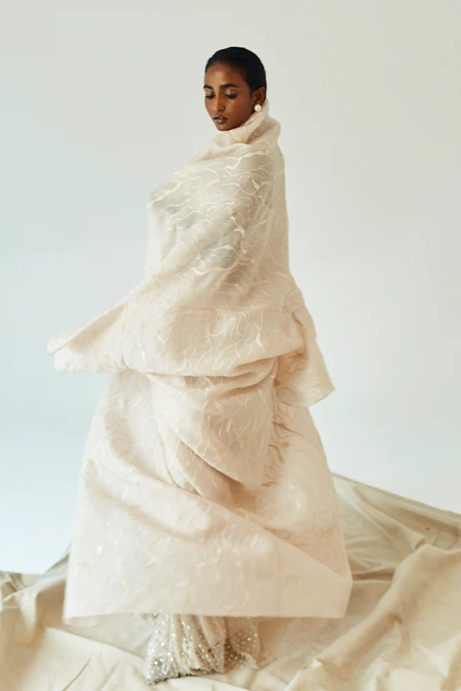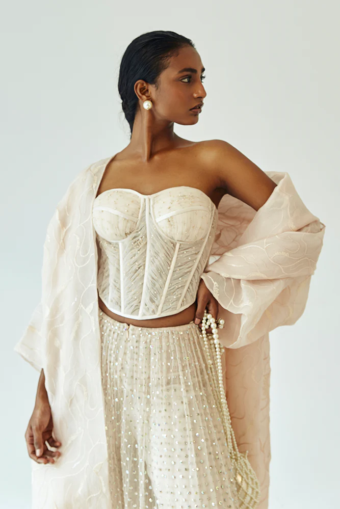 CRAFTED WITH LOVE, THIS EMBELLISHED RUCHE NET CORSET PAIRED WITH FULLY EMBELLISHED NET PANTS WITH ADDITIONAL SATIN UNDERPANTS. STYLED WITH STATEMENT-MAKING SELF EMBROIDED JACKET MADE IN ORGANZA.