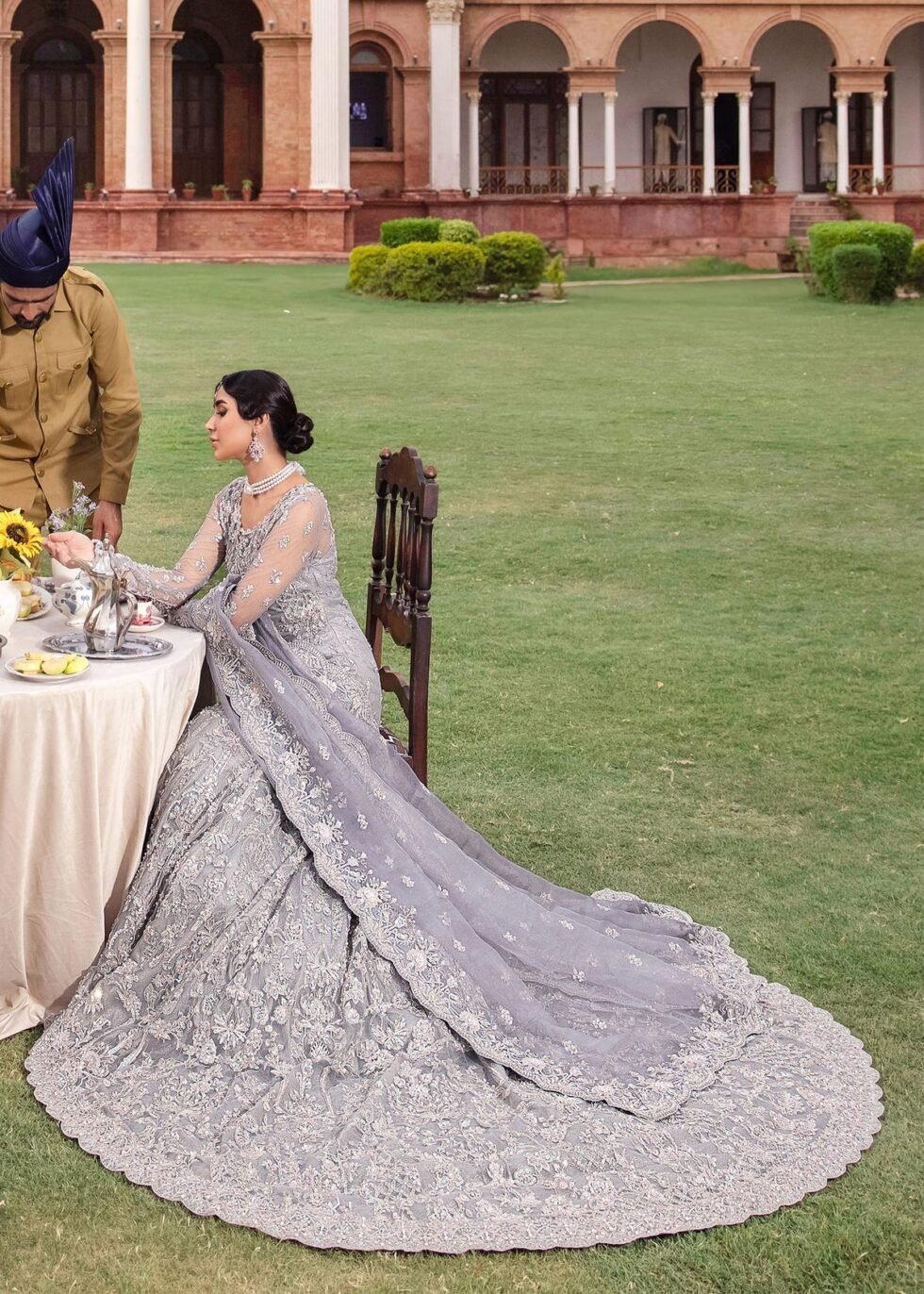 Experience the perfect fusion of timeless elegance and modern allure with this exquisite grey mermaid cutline ensemble. Featuring a stunning shirt, lehenga, and dupatta, this outfit showcases a seamless blend of classic charm and contemporary beauty. The net shirt is intricately hand-embellished with shimmering silver work, complemented by delicate hues of blues and pinks, creating a captivating and refined effect. Paired with a trail lehenga adorned with lavish embellishments, the ensemble exudes sophistication and grace.