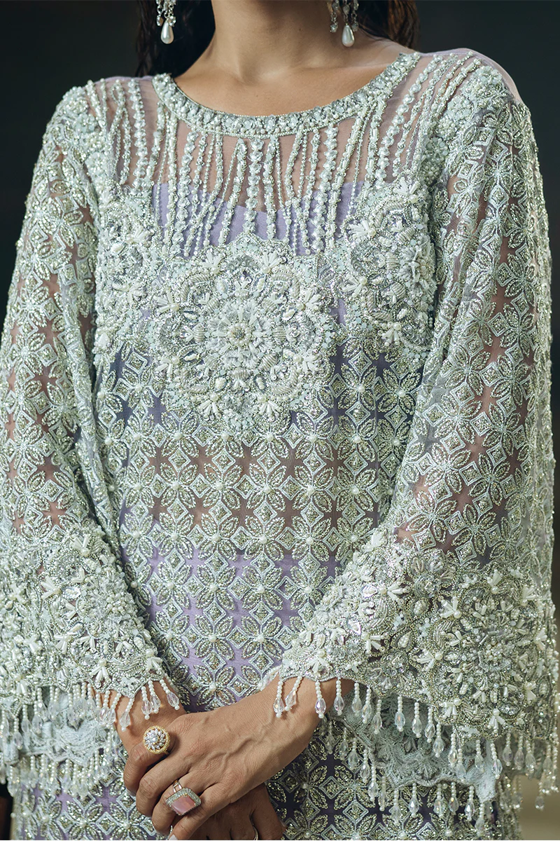 A stunning blend of elegance and sophistication, featuring an embroidered net shirt paired with luxurious raw silk trousers. The look is completed with an ethereal organza dupatta for timeless elegance.