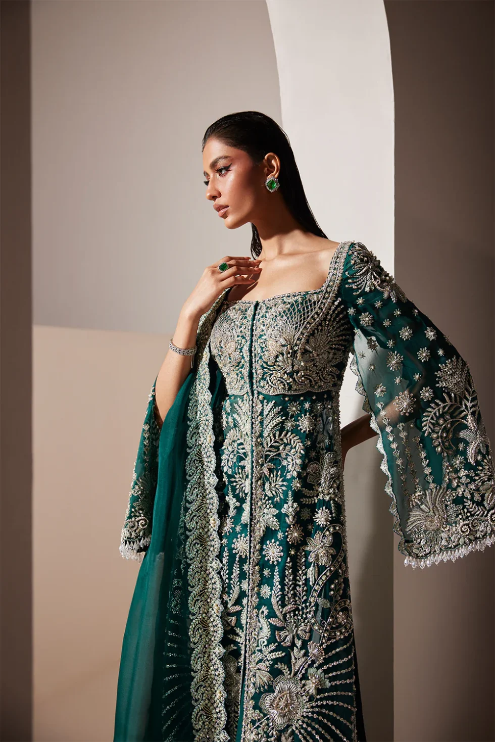Luxe is a mesmerizing viridescent emerald organza flared gown, adorned with modern, rich silver dhabka, hand beaded details and captivating cape sleeves, elegantly finished with hanging beads paired beautifully with organza duppata heavily embroidered on borders. The ensemble is perfectly complemented by sleek raw silk trousers.