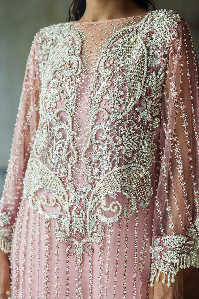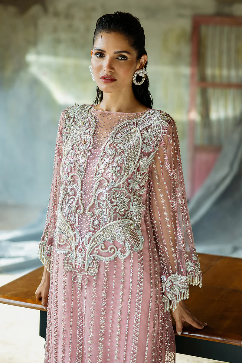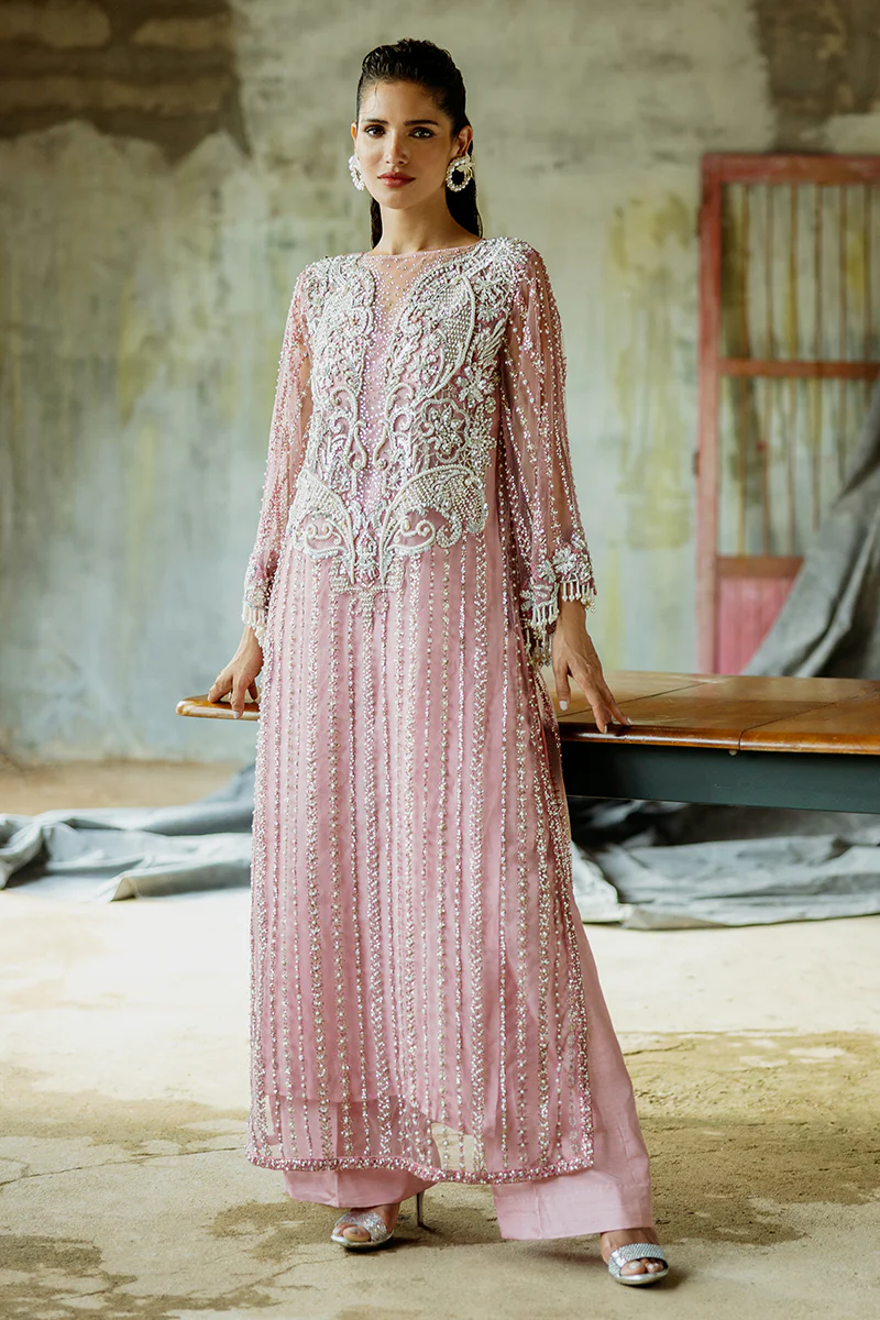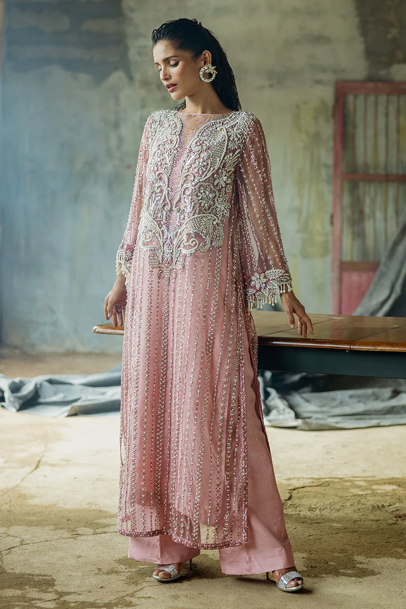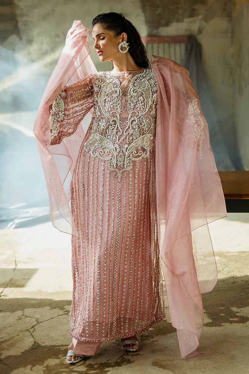 A stunning blend of elegance and sophistication, featuring an embroidered net shirt paired with luxurious raw silk trousers. The look is completed with an ethereal organza dupatta for timeless elegance.