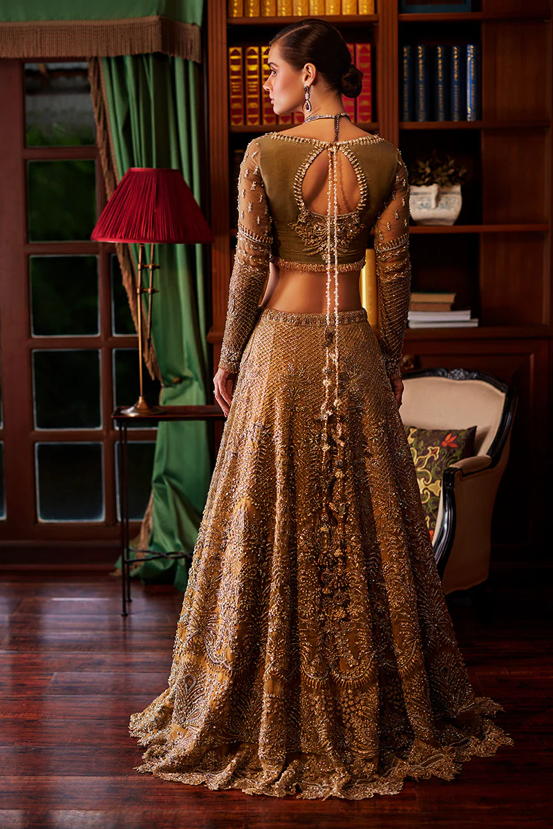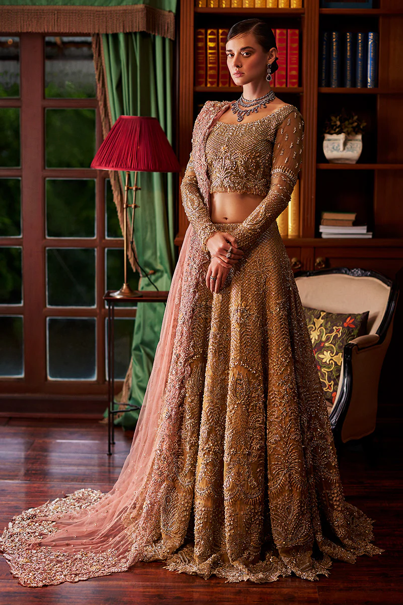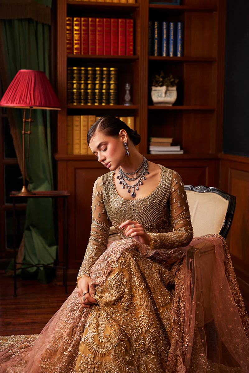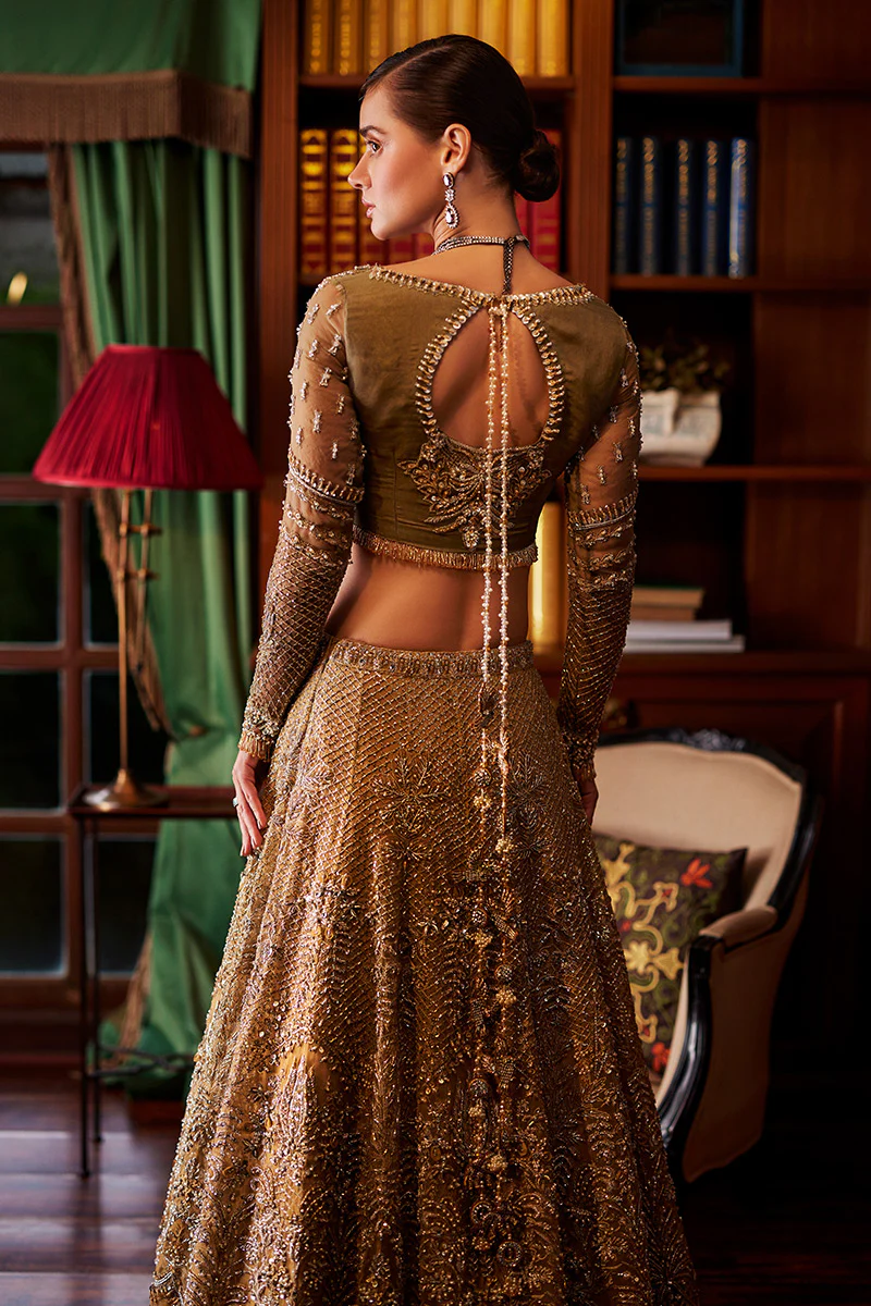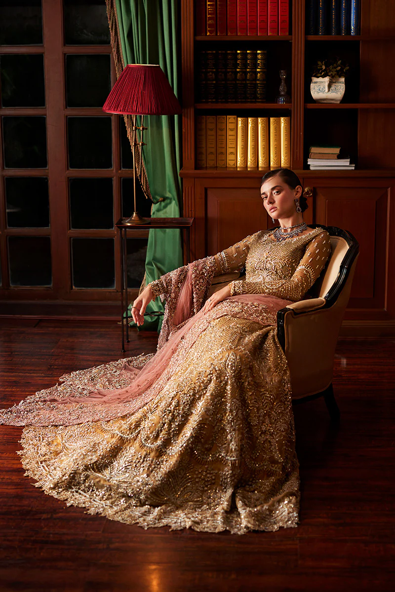 Prepare to be enchanted by Lysandra, a manifestation of timeless elegance and opulent detailing. This bridal ensemble features a hand-embroidered embellished details, accentuated by clusters of naqshi, sequins and Swarovski crystals. The flowing silhouette, crafted from layers of soft silk organza, adds a touch of ethereal grace. Lysandra is a tribute to the bride who appreciates intricate craftsmanship and desires a look that is both classic and contemporary.