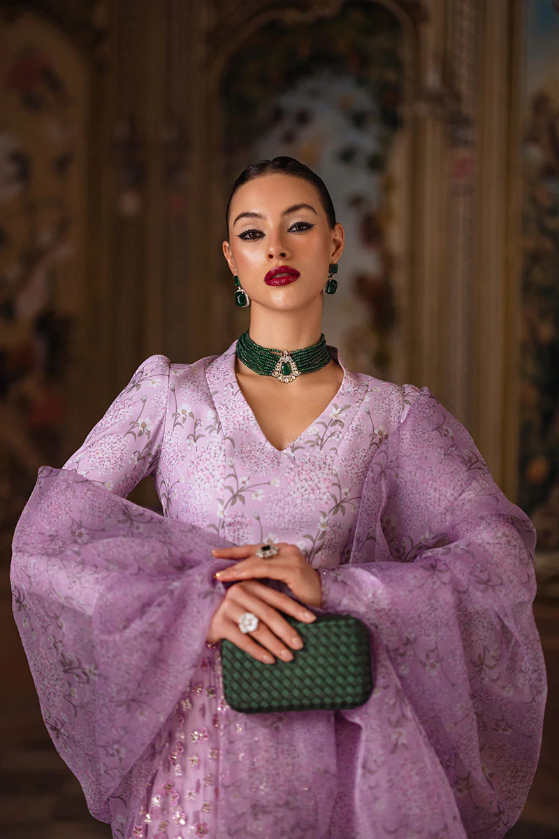 Margot blends opulence with grace, showcasing a printed silk bodice and a sequined embroidered net peshwaas. Complete with a 5-yard printed organza dupatta, it’s a statement of timeless elegance.