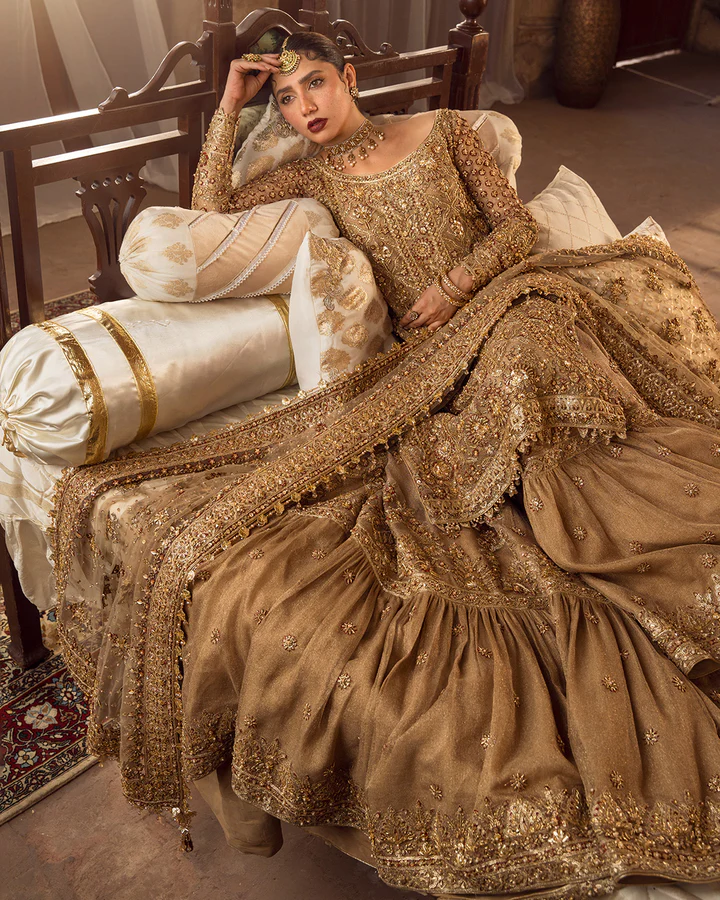 Fashioned in a dainty khaadi net fabric, Naisha is an epitome of classic elegance. This set features a tessellated jaal of hand-cut sequins, dabka and naqshi layered with contrasting red blooming florals etched in resham and zardozi. Its richly detailed jaal is entwined with linear design accents wrought with cut dana and tilla that run through the length of the shirt. Paired with a gorgeously ornamented farshi gharara, gold dupatta adorned with an encrusted border all over and a contrasting red chaddar, Naisha is timeless in appeal.
