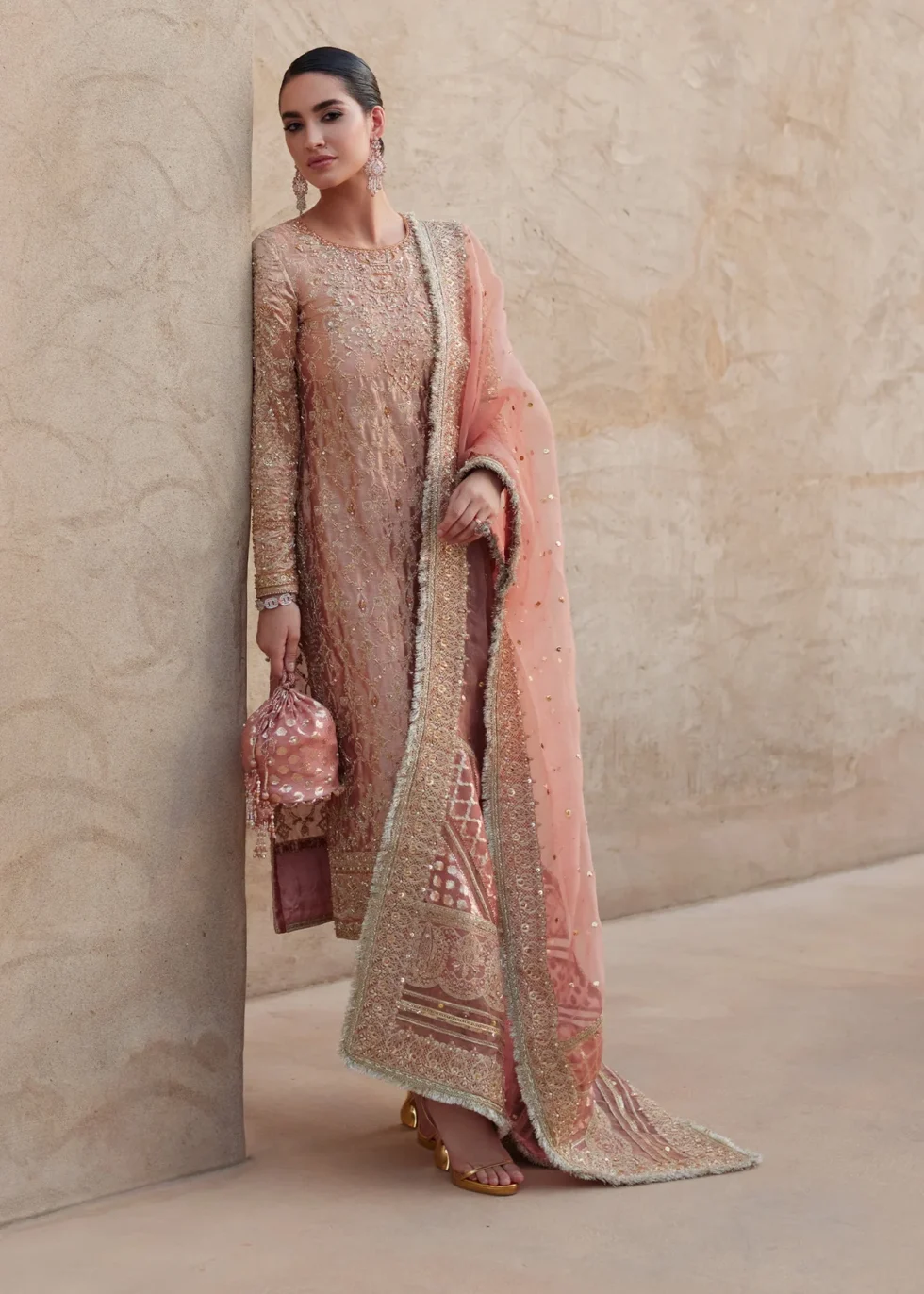 Dive into luxurious elegance with Nera, a stunning blush pink tissue ensemble that exudes timeless beauty. The outfit features delicate embroideries and intricate hand embellishments, bringing an air of sophistication to the graceful silhouette. Paired with culotte pants in raw silk, Nera effortlessly blends modern style with traditional charm. The ensemble is completed with a Mukesh dupatta, framed by four-sided borders and embellished with badla fabric on the pallu side, adding an extra layer of intricate detail. This look is the epitome of ethereal and easy elegance, perfect for those who appreciate refined luxury.