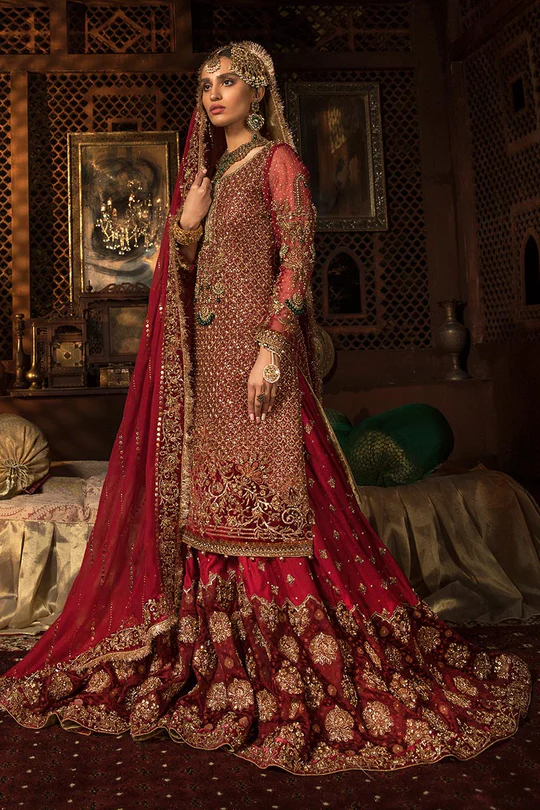 Our signature ‘NESSA’ Lehenga Set is inspired by Mughal architecture and their blooming gardens. The intricate floral motifs are brought to life with handwoven dabka naqshi, zardozi, wasli technique, and mukesh work imbued with velvet patches by master artisans turning your big day look into timeless beauty.