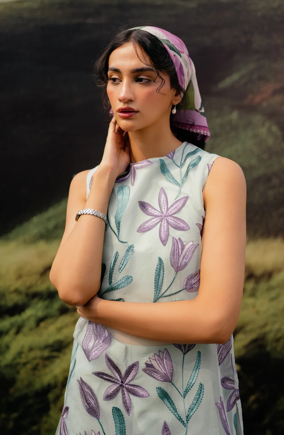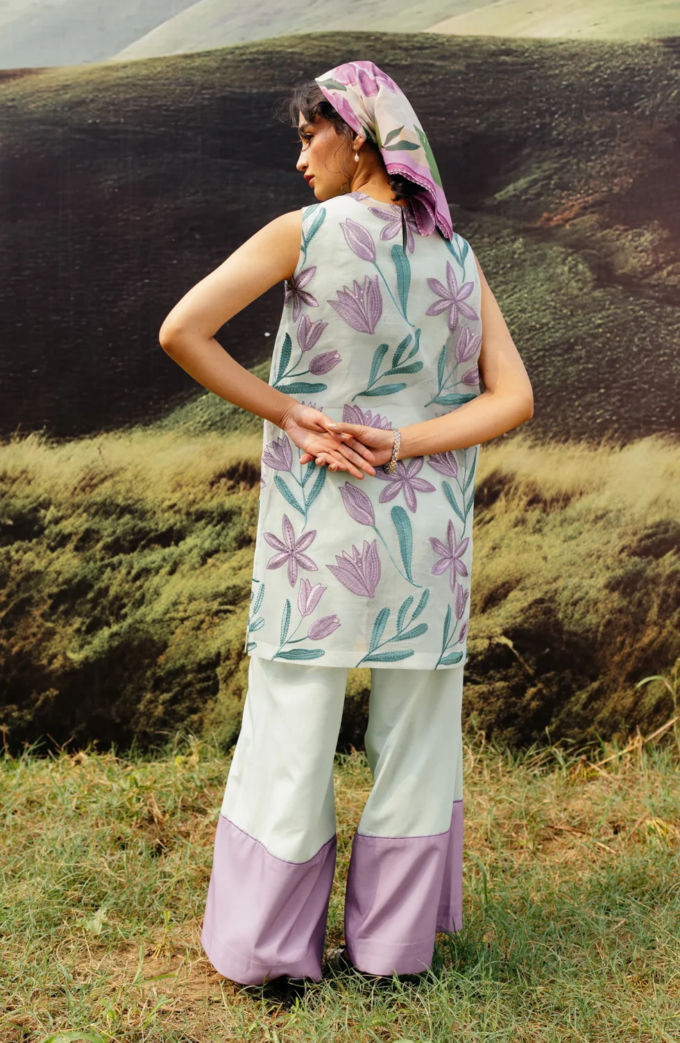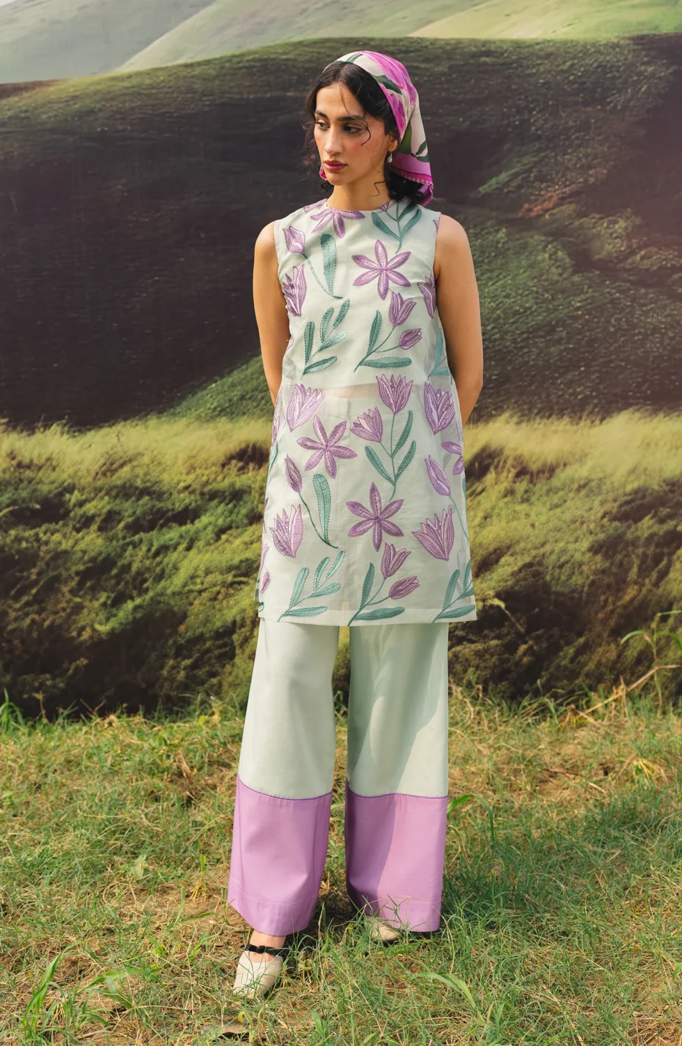 Grace in hues, a sea green organza shirt with lilac embroidery, paired with matching inner and chic color-block pants.