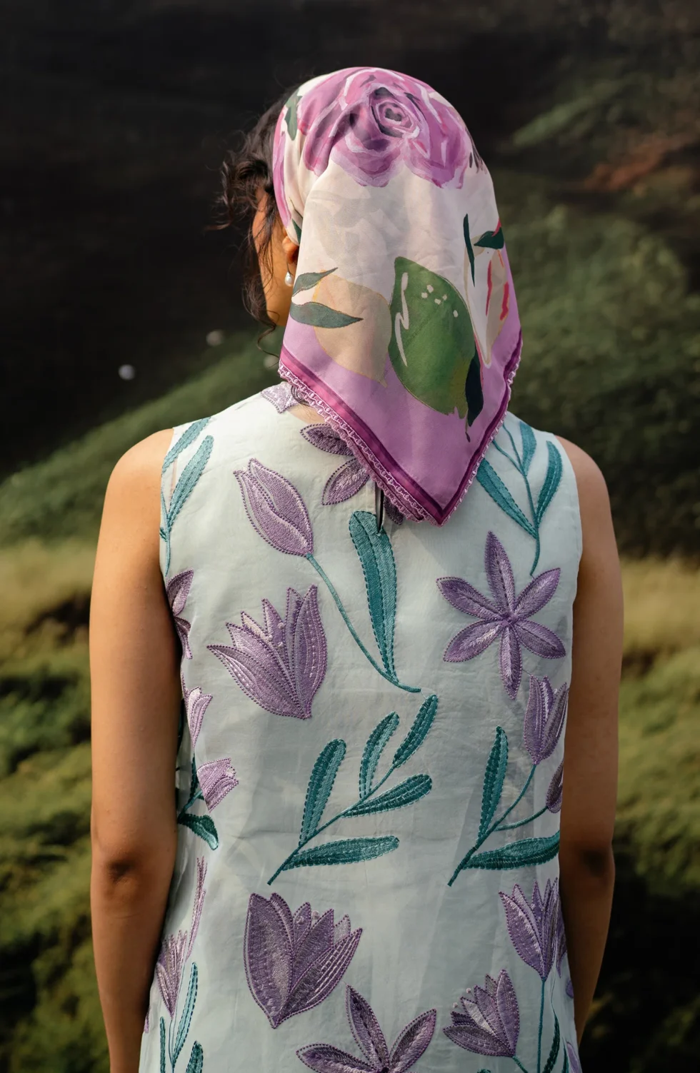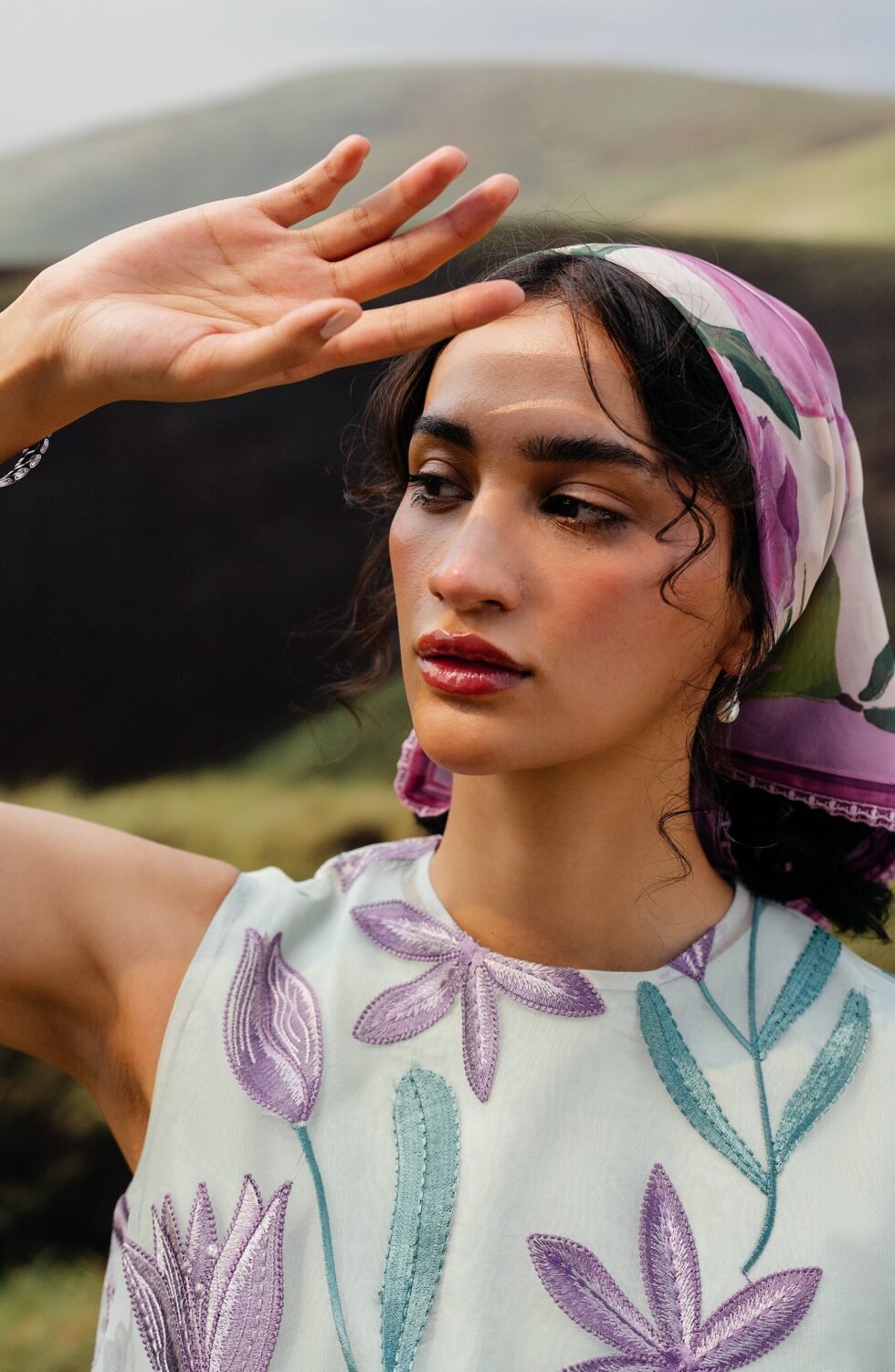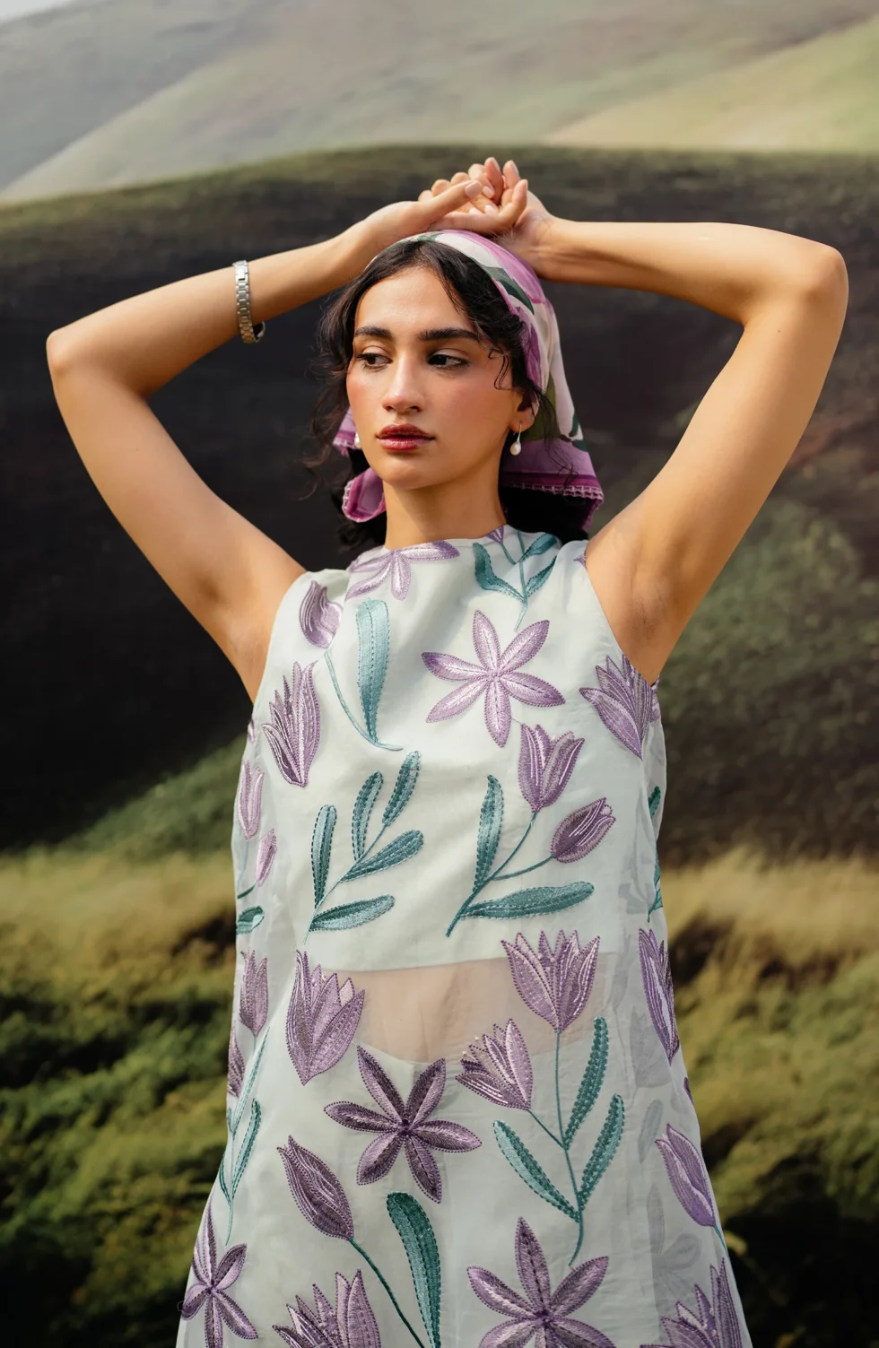 Grace in hues, a sea green organza shirt with lilac embroidery, paired with matching inner and chic color-block pants.