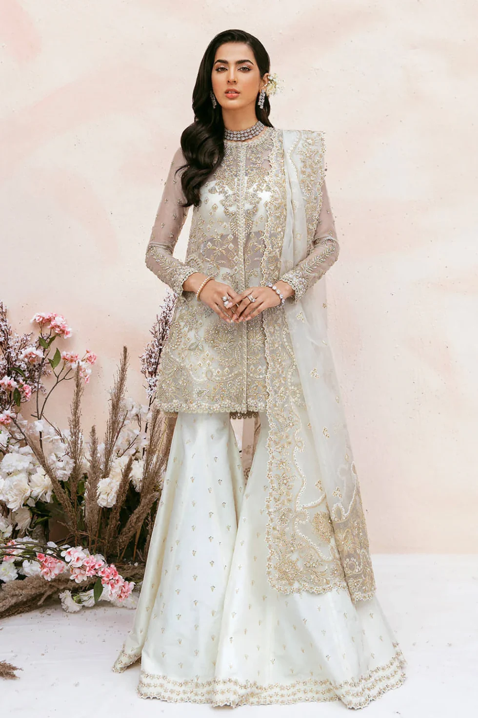 Enthralling pearl white jacket crafted on luxuriant organza with love. Adorned with hand-embroidered gold threads, bejewelled with hand embellished precious gems, gold zari and lush sequins. Dainty florals and ethnic motifs lace this dream like an ensemble. Paired with raw silk flared bell bottoms finished with delicate gold hand embroidery. Organza dupatta with exquisite hand-embroidered and embellished borders and pallus.