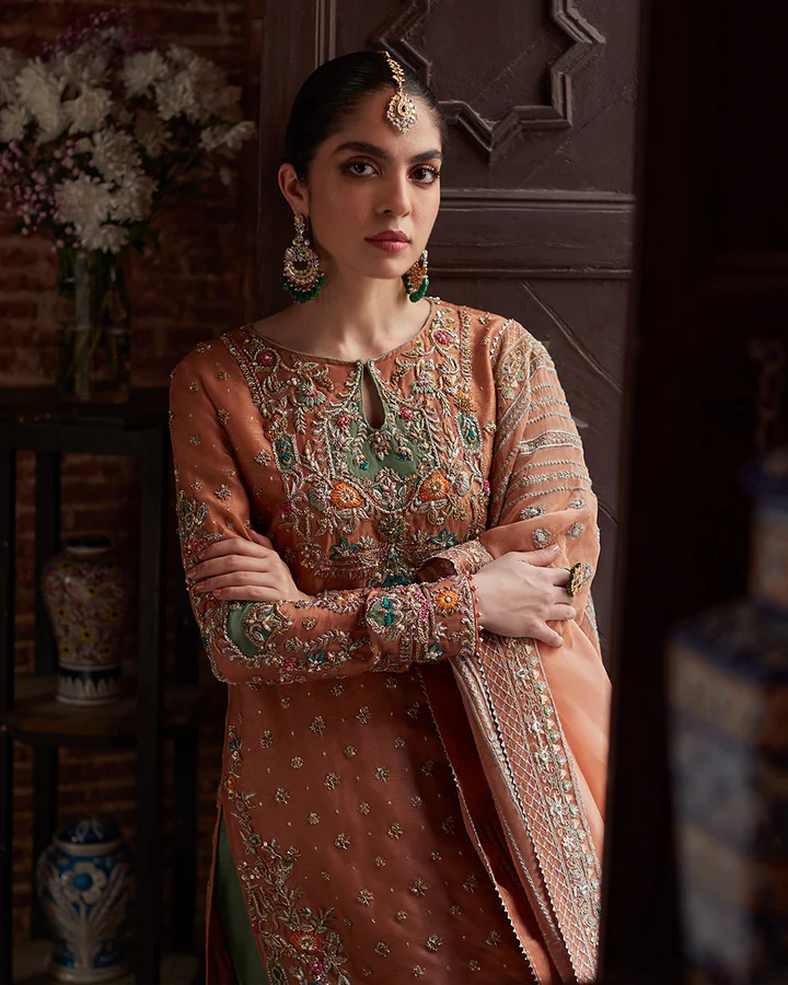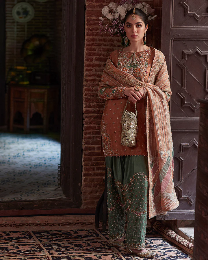 Embrace the festive season with Pelin. A rust orange kameez embellished using kora, dabka, and crystals comes paired with a worked green shalwar. The look is completed with an embroidered organza dupatta.
