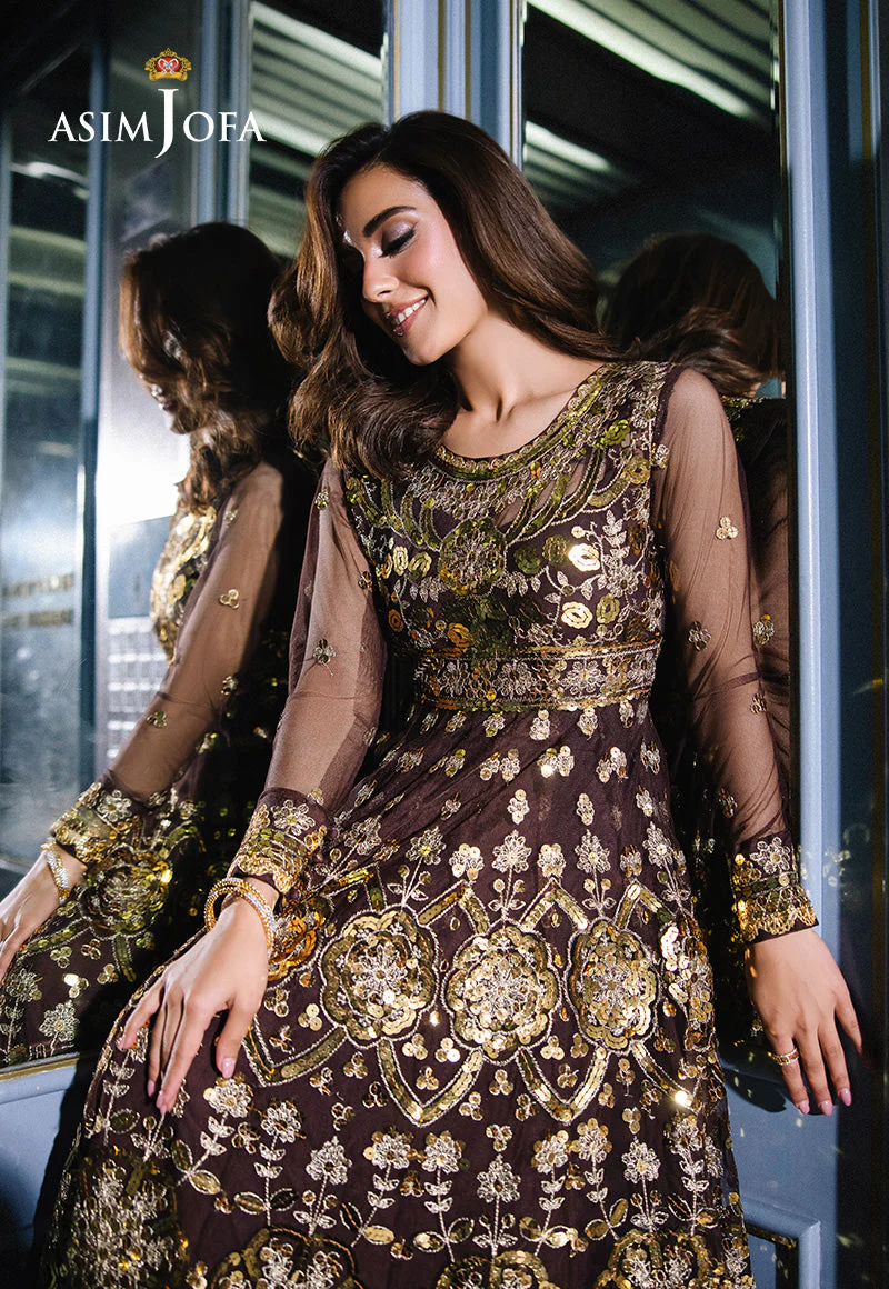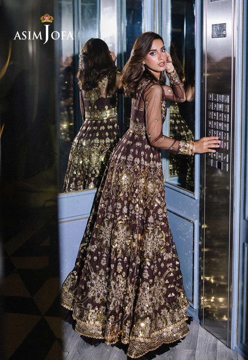 Radiating timeless allure, this brown long-flared peshwas is a true testament to royal sophistication. The bodice and voluminous silhouette are intricately adorned with glimmering 9mm gold sequins and gorgeous gold zariwork, creating a mesmerizing visual of texture and shine. The lavishly embroidered dupatta completes the look, adding layers of elegance and finesse. This ensemble is a showstopper for any grand celebration, designed to leave an unforgettable impression.