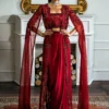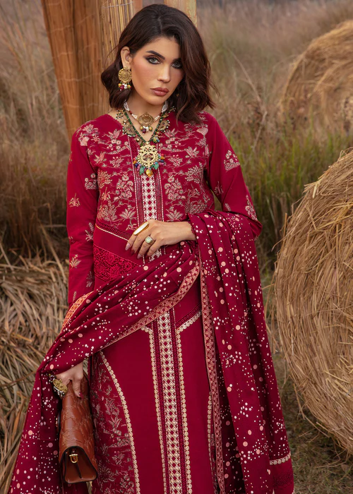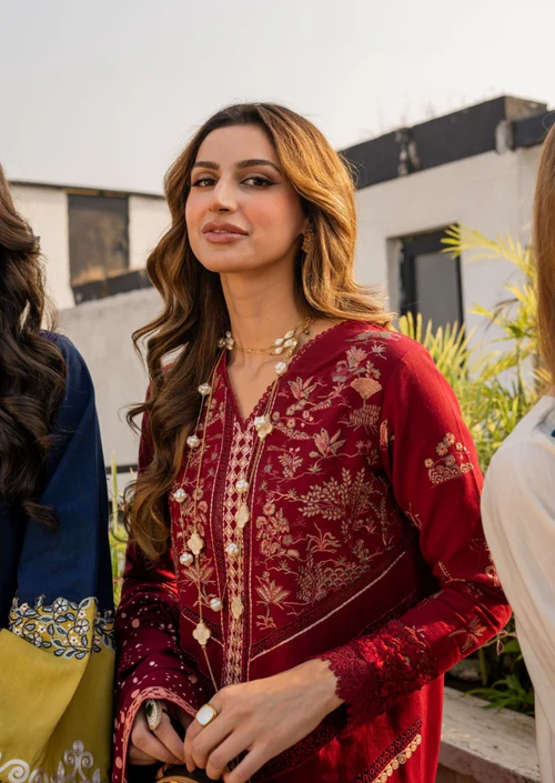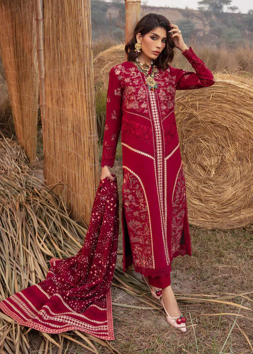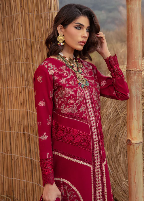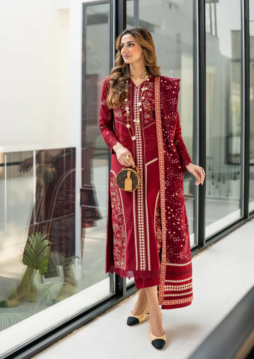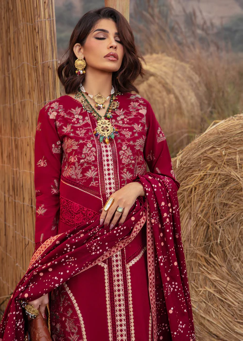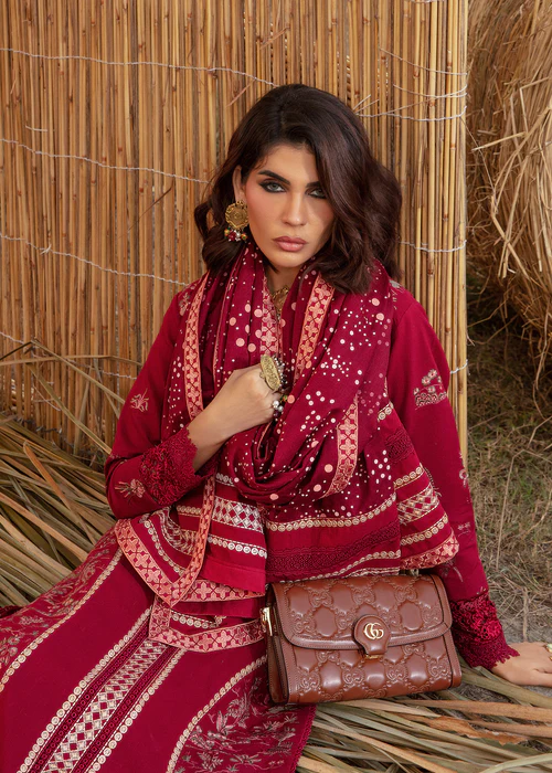 Ruby! This winter’s IT color. Nothing screams elegance as a jewel tone. This stunning ensemble features miniature scenery embroidered delicately in tones of pink and olive. The shirt has laces running down the centre and cutwork panels on the side and sleeves. The shawl is screen printed with polka dots in shades of pink, the pullu’s are adorned with linear embroidery, finished with a geometric border. Color Type: Maroon Size: S, M, L Gender: Women Category: Clothing Outfit Type: Eastern Ready to wear Sub-Category: Kurta Set Lining Attached: Full Lining Product Type: Festive/Party Wear Season: Winter Wear Shirt Fabrics: Khaddar