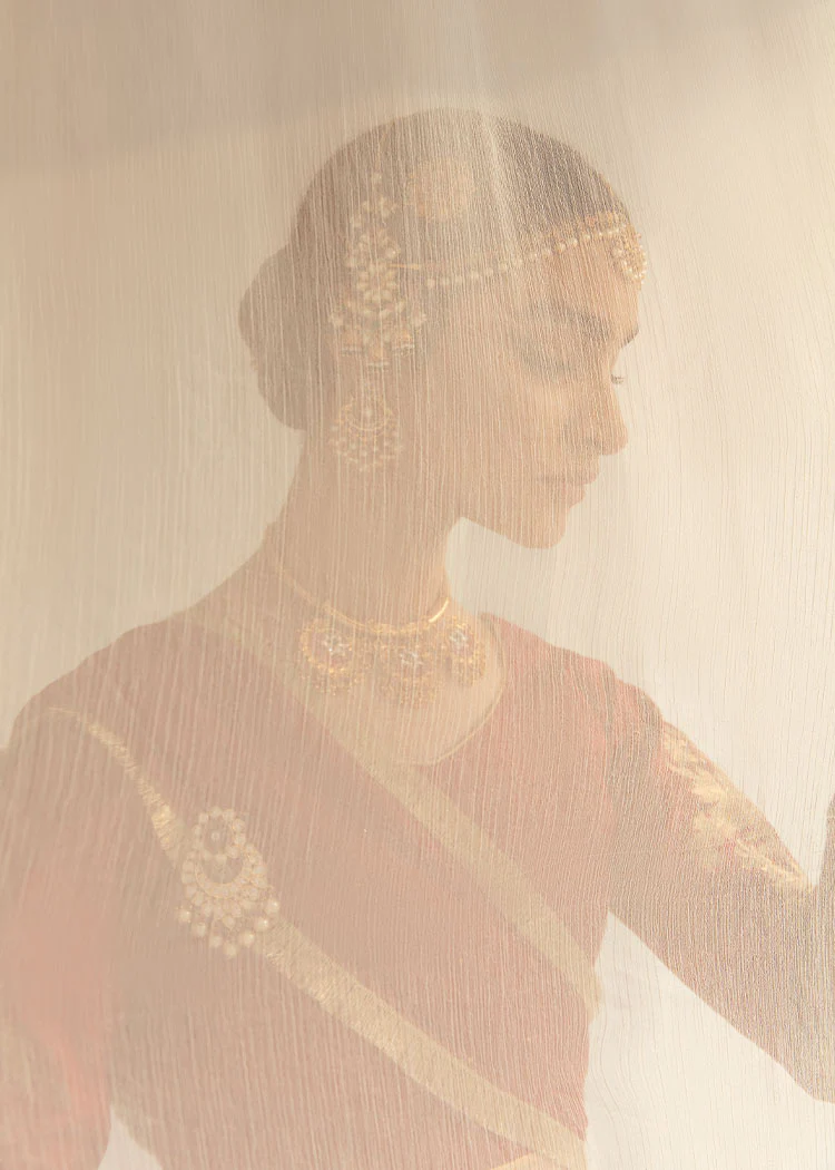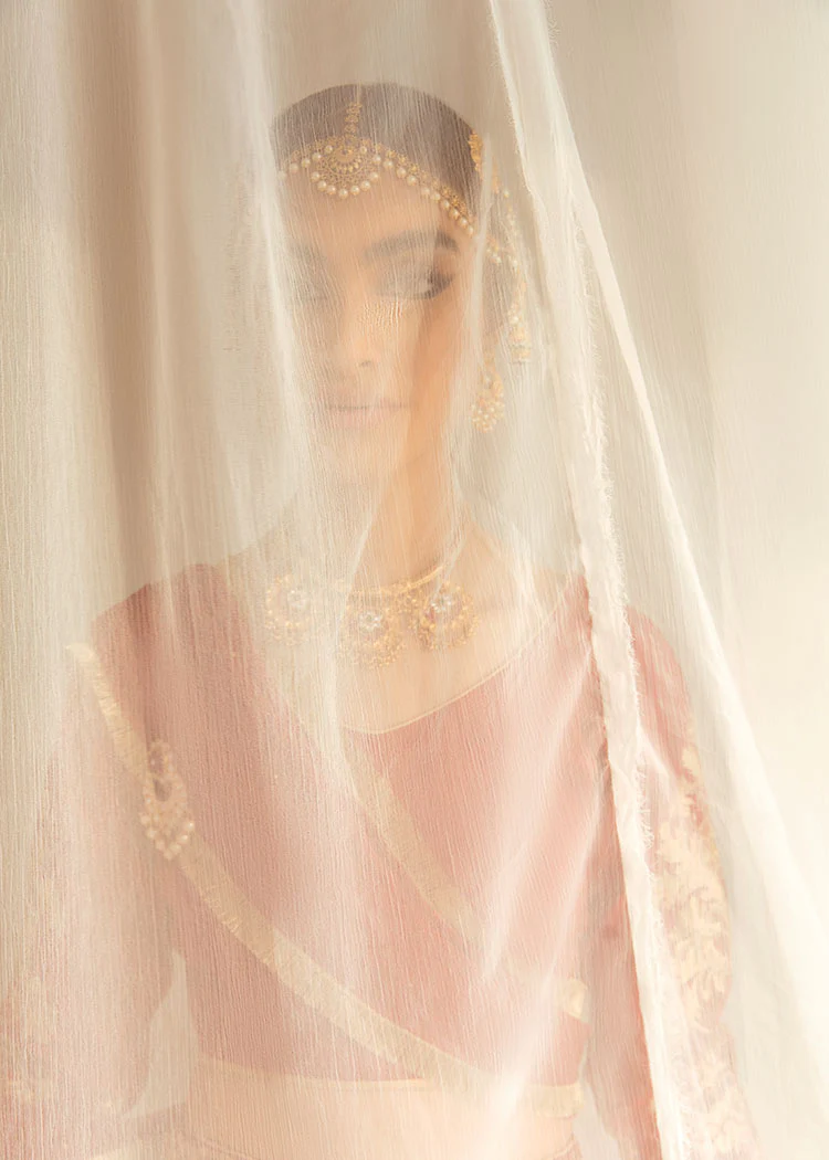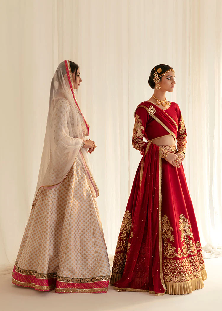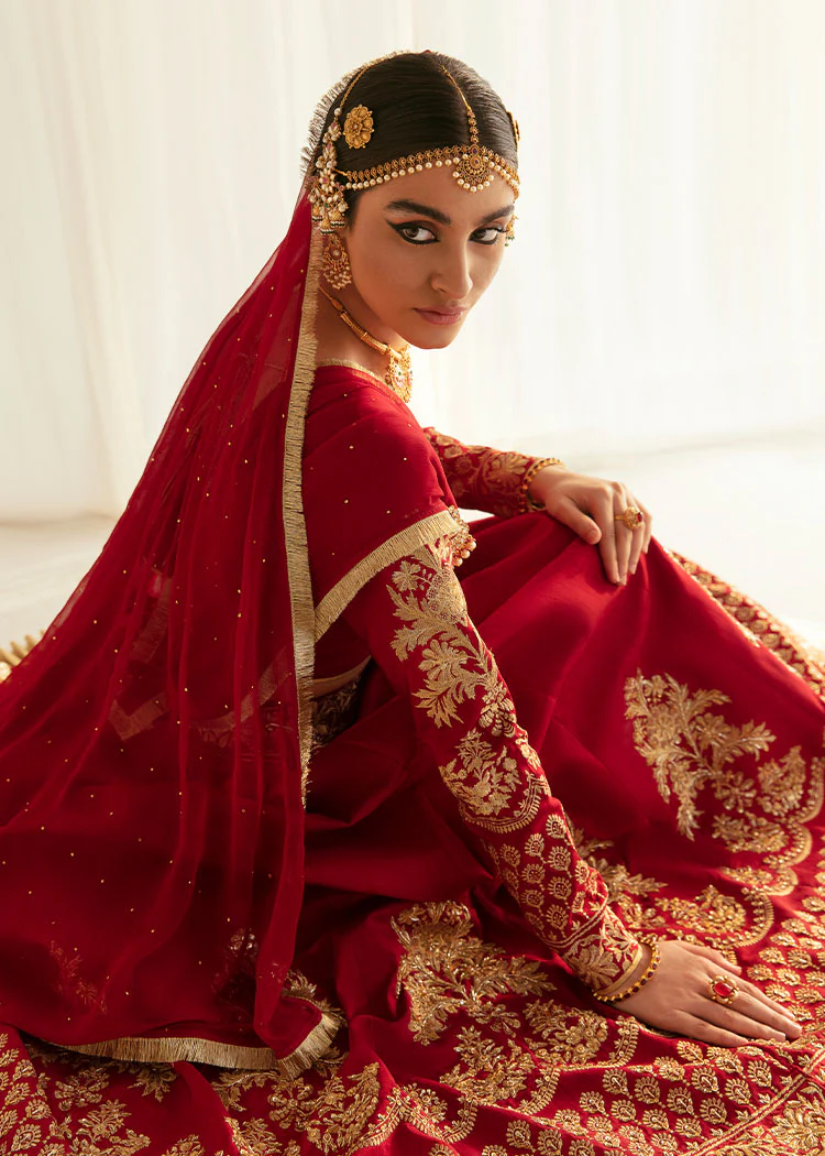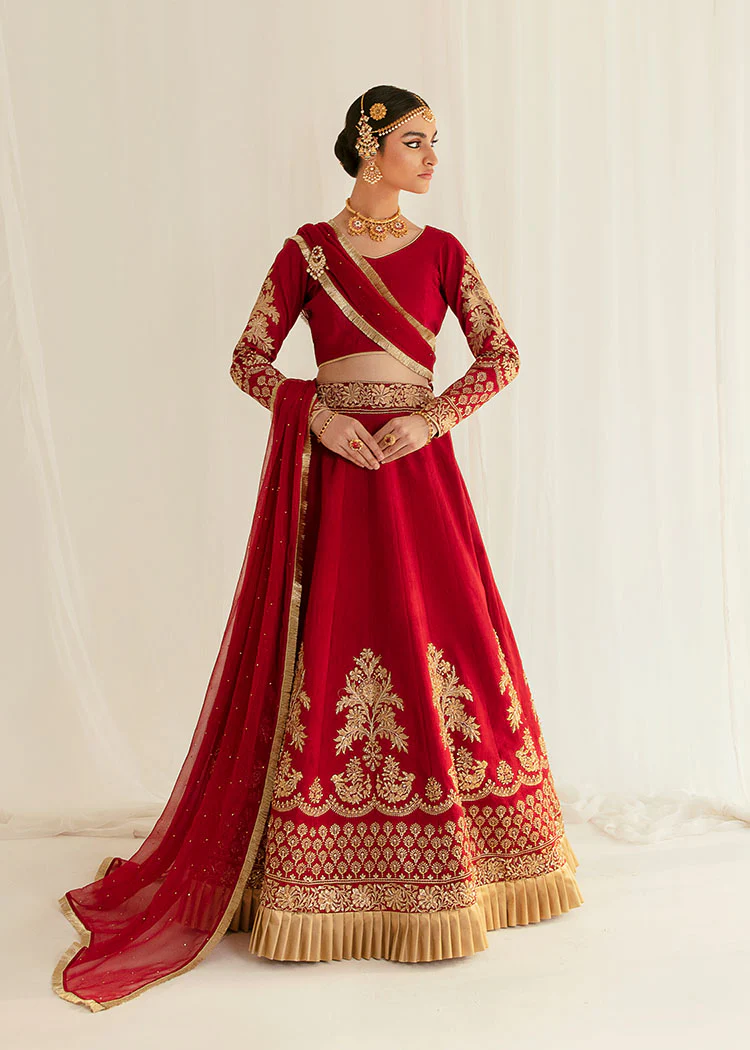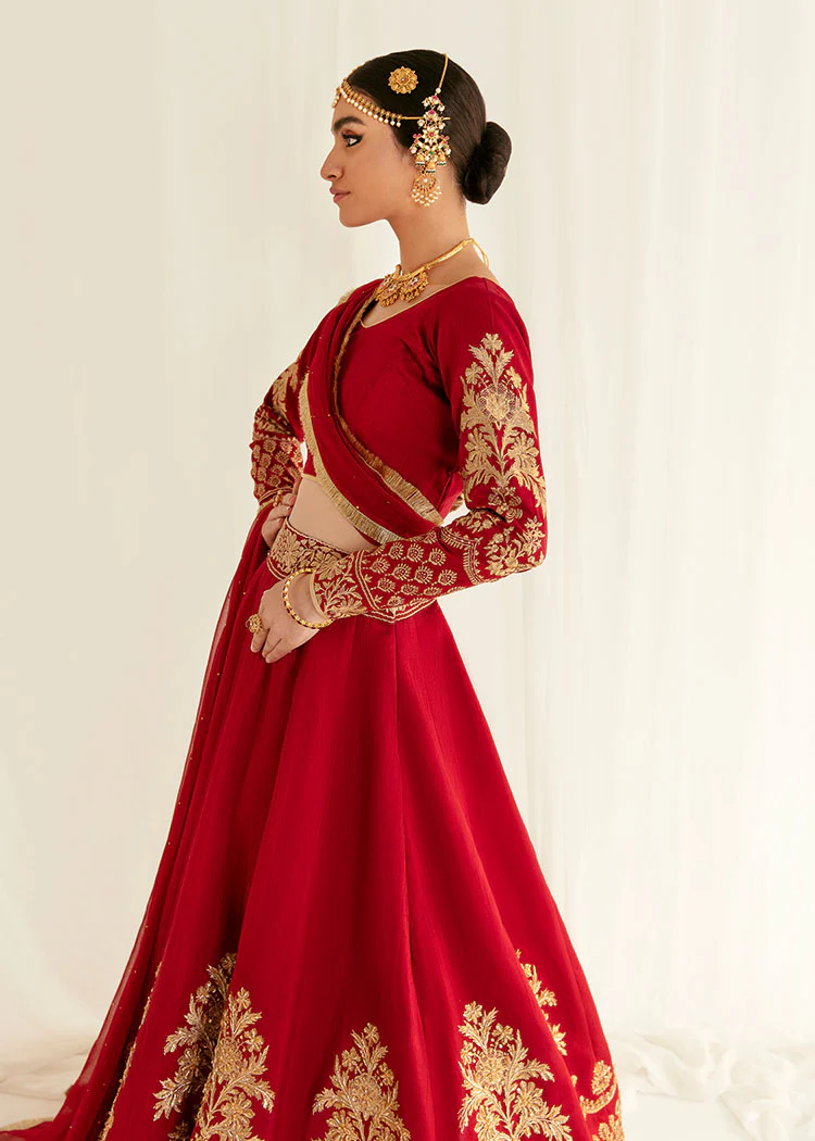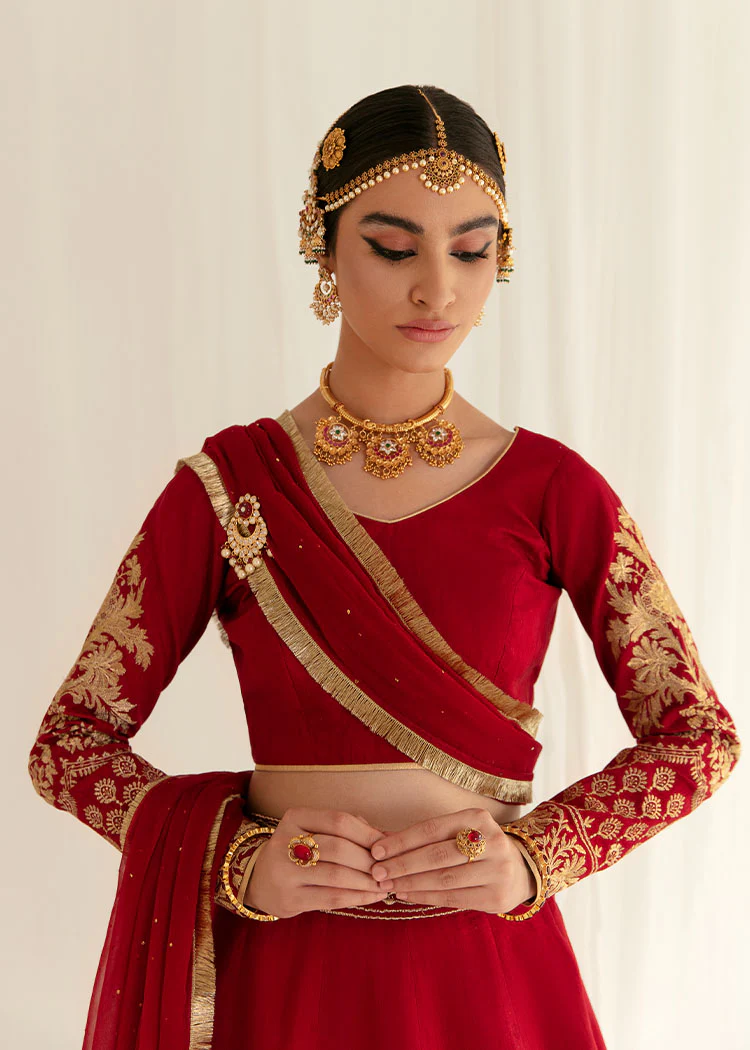 The deep red outfit is made on Korean raw silk. The lehenga has heavy work on it featuring dabka, nakshi, tilla and sequins work. The outfit is paired with chiffon dupatta with kamdani chun on it.