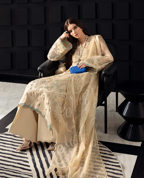 Discover the Ori dress, a masterpiece of exquisite elegance adorned with intricate French botanical embroidery. Subtle ice blues and delicate yellows create a mesmerizing color-block effect, finished with scalloped yellow lace. The bell-shaped sleeves feature intricate details and shimmering sequins, while the hem is enhanced with gentle waves and intricate lace. Crafted from organza and raw silk, with a French net dupatta and raw silk trousers, this ensemble radiates glamour and sophistication.
