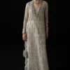 Experience the essence of opulence with ‘Trésor,’ a creation adorned with luminous obsidian crystals and intricate cutwork. The ensemble showcases a refined, elongated silhouette with a tailored shirt and a chic cropped jacket, lavishly embellished with